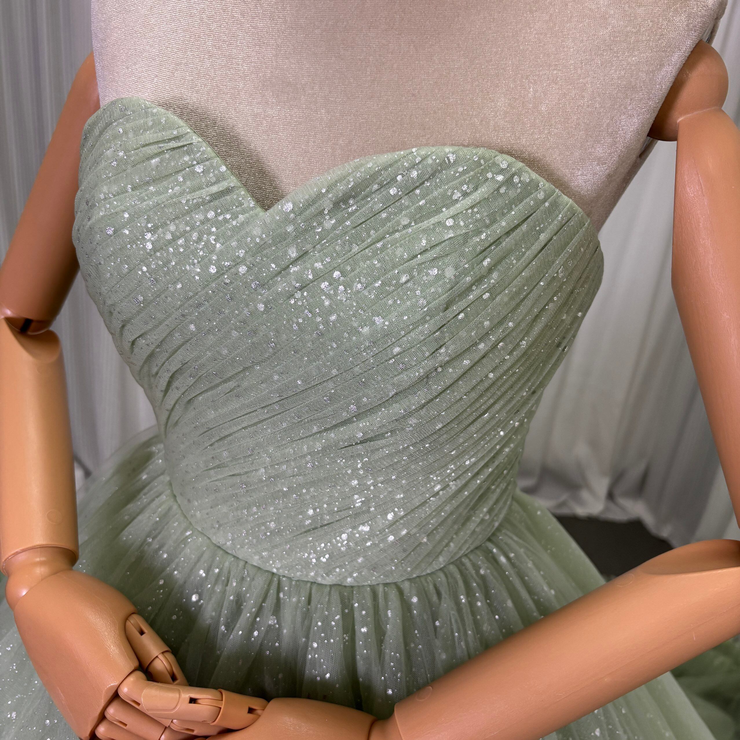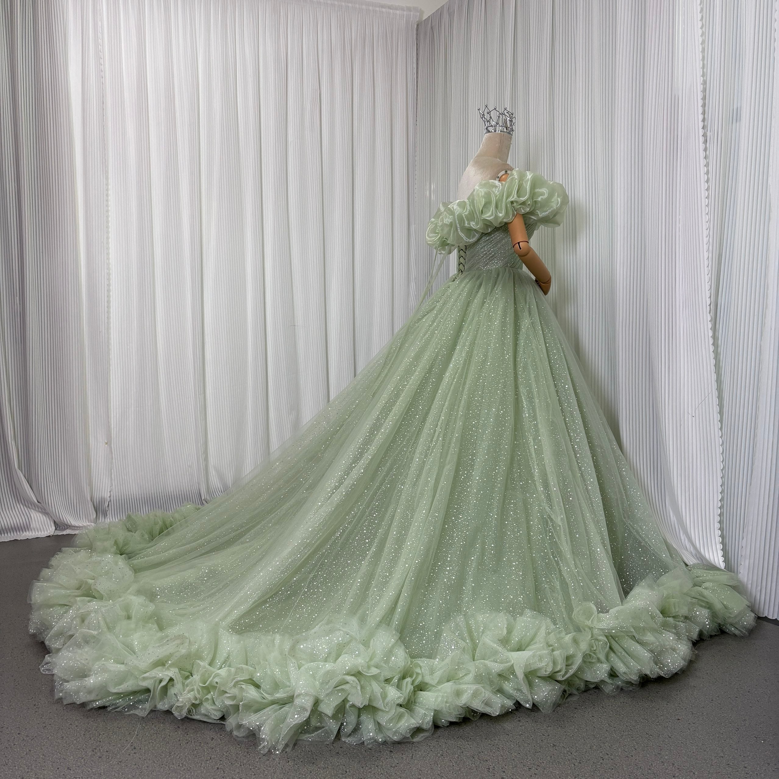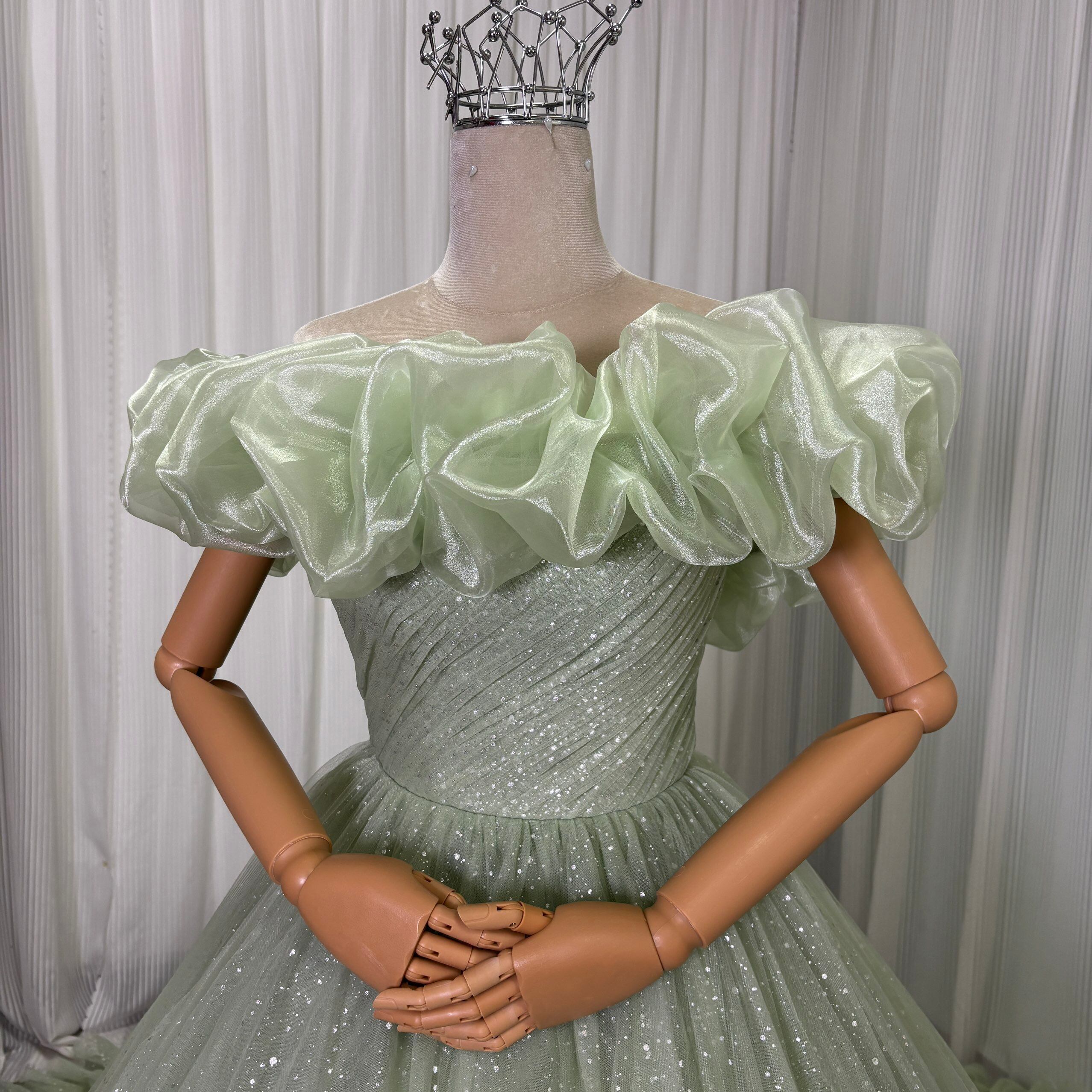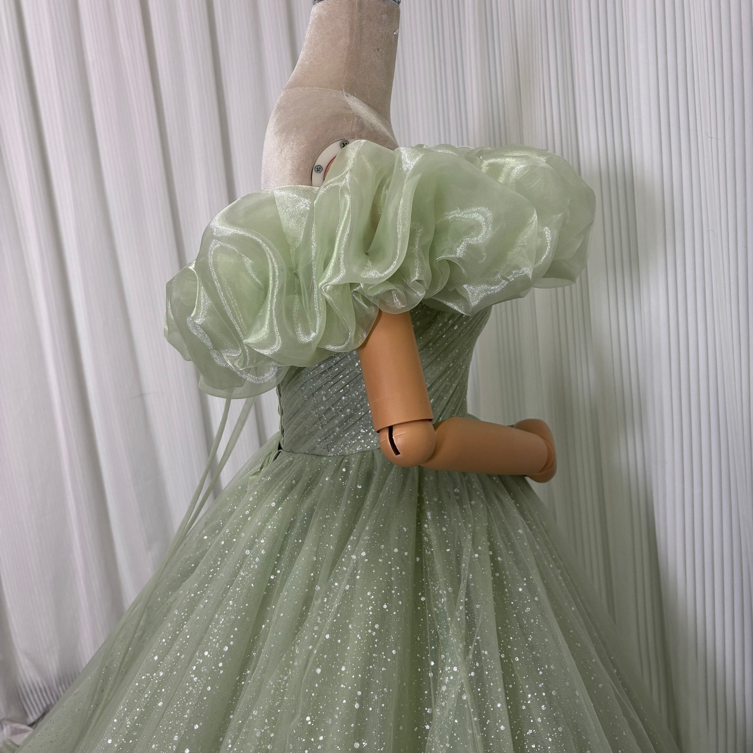 カラードレス ミントグリーン キラキラチュール 取り外しオフショルダー フレアスカート ラッフルフリル 編み上げ 花嫁