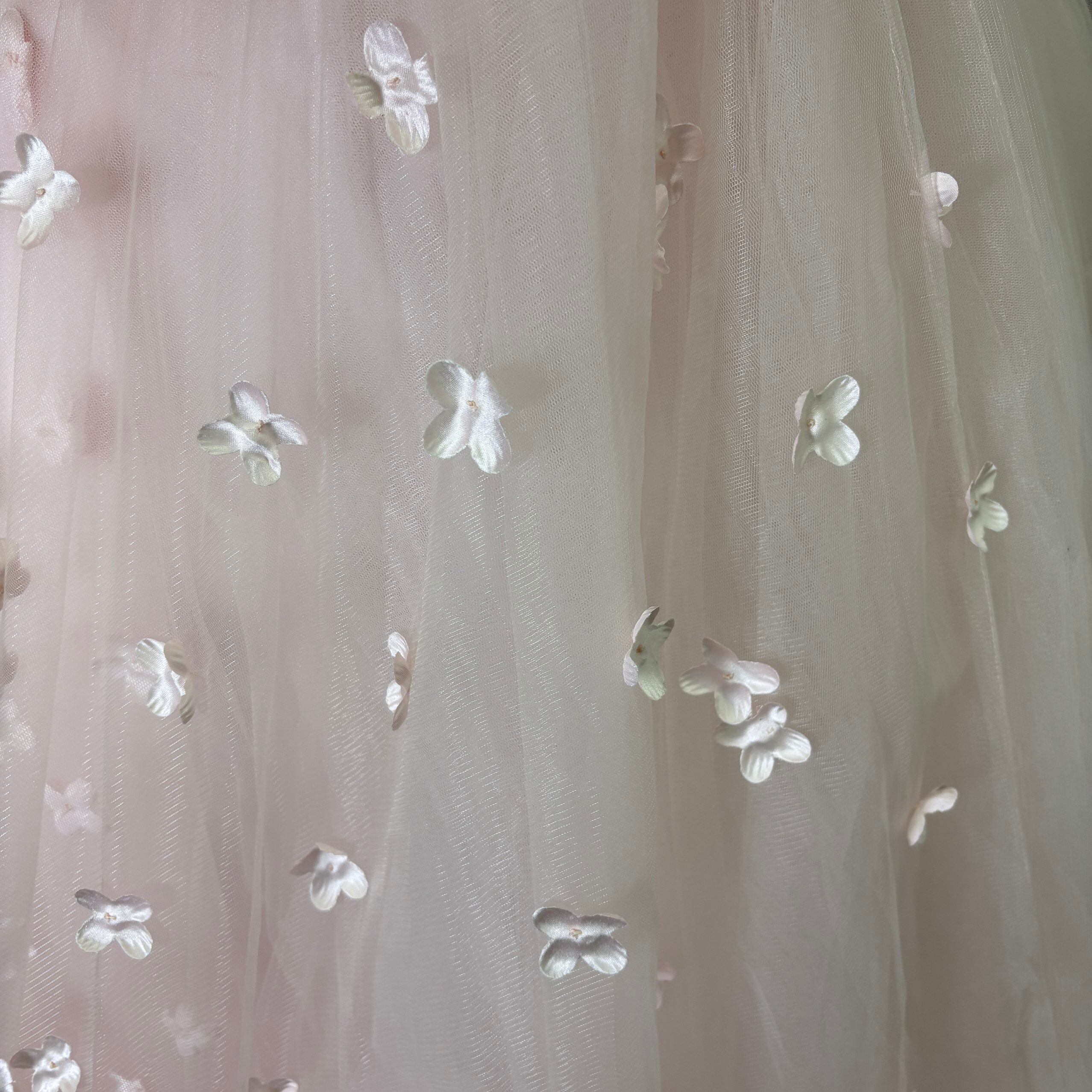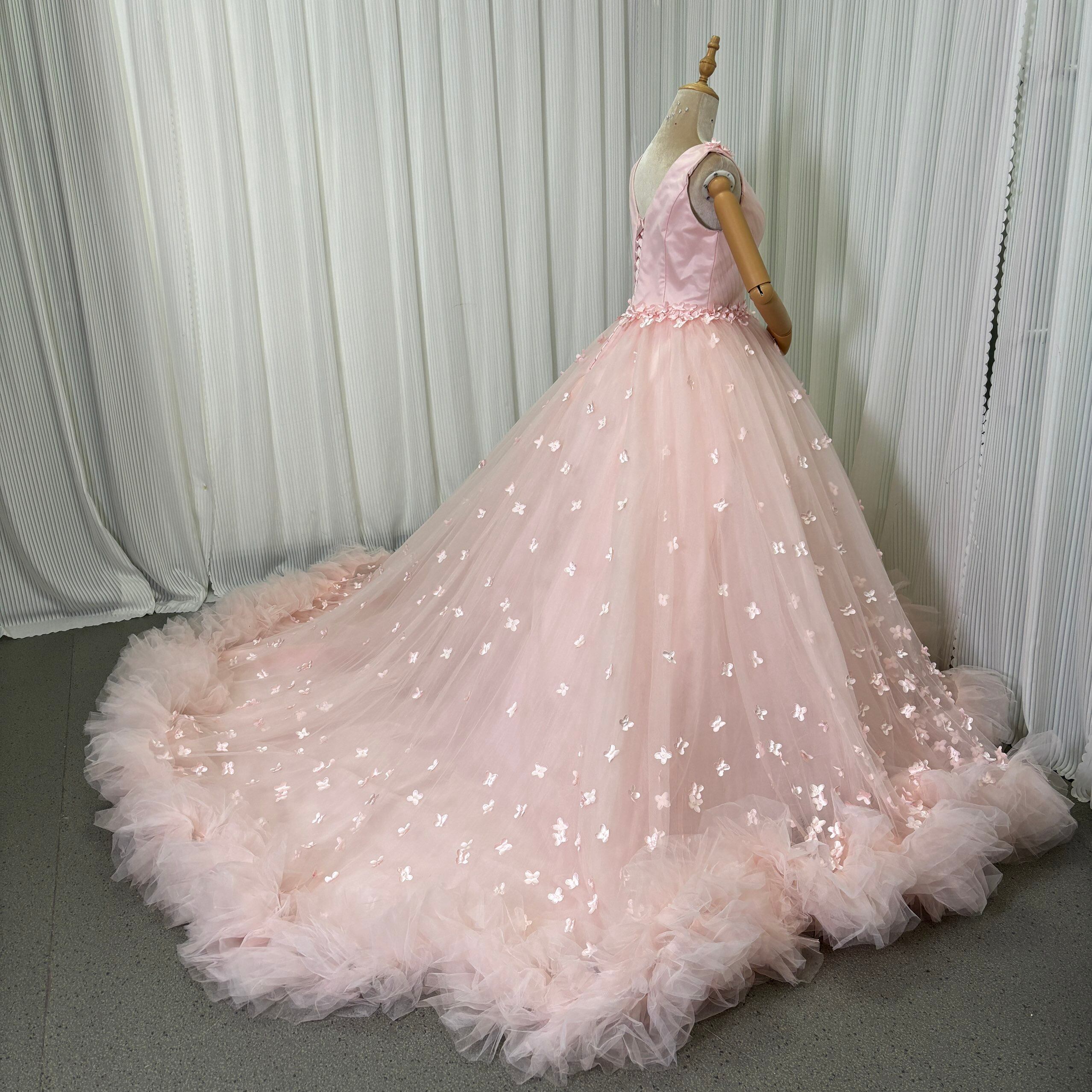 カラードレス 薄桃色 Vネック 花モチーフ ボリュームドレス ラッフルフリル ロングトレーン 前撮り