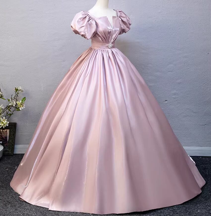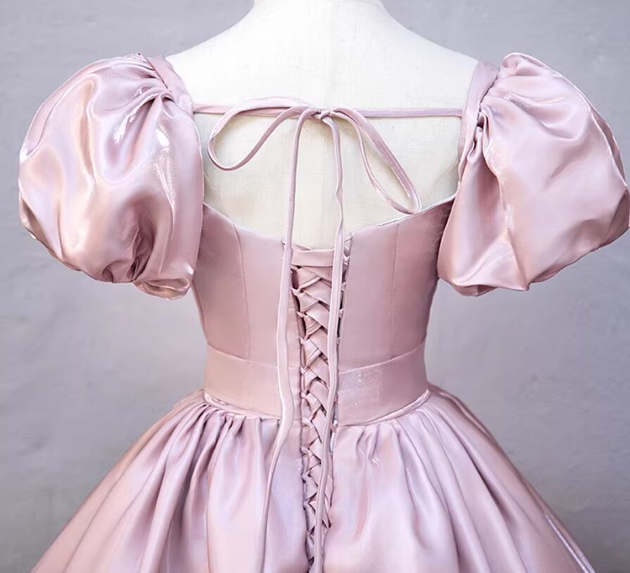 カラードレス ピンク スクエアネック 光沢サテン フレアスカート 編み上げ 演奏会/音楽会