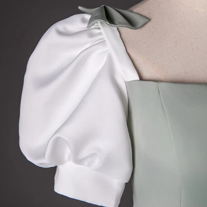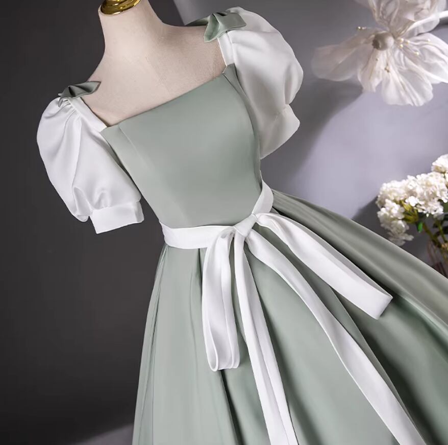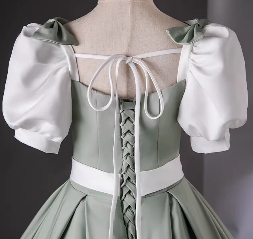 カラードレス グリーン スクエアネック パフスリーブ プリンセスライン サッシュベルト 編み上げ 花嫁