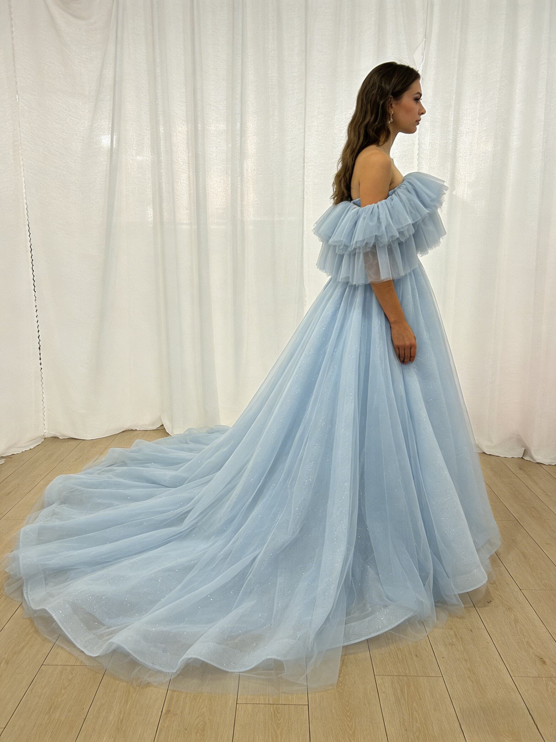 カラードレス ブルー オフショルダー キラキラチュール ロングトレーン 憧れのドレス 披露宴