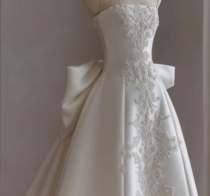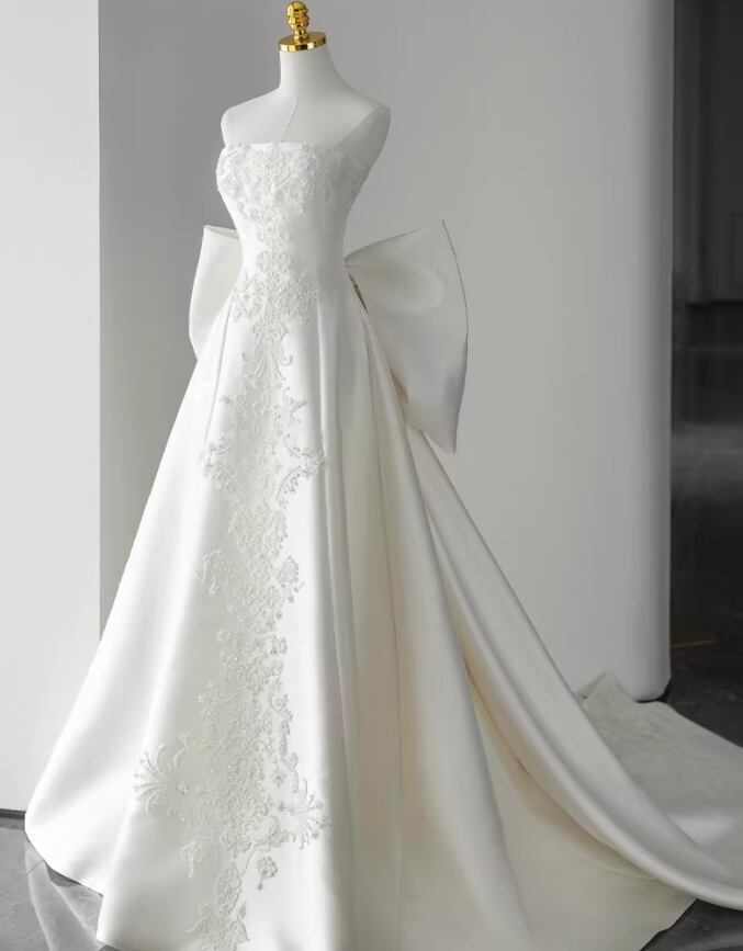 ウエディングドレス ベアトップ キラキラ光る刺繍 豪華なバックリボン ロイヤルサテン 結婚式