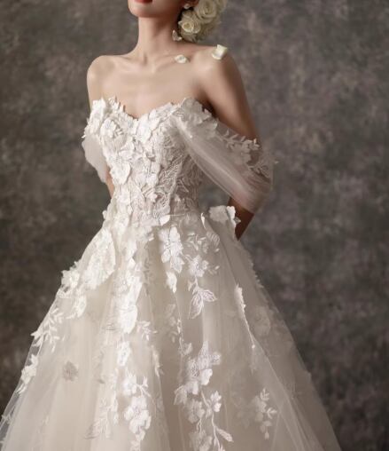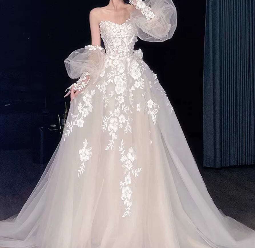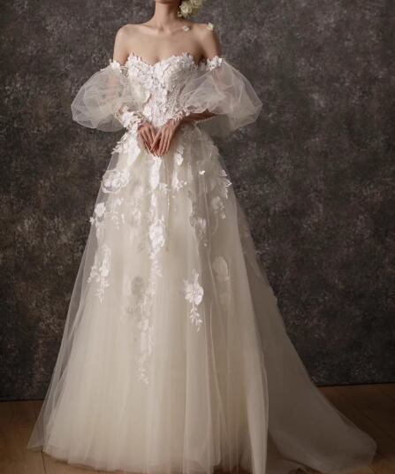 フランス風 ウェディングドレス ベアトップ パフスリーブ 美しい花レース 拳式/前撮り ふわふわドレス