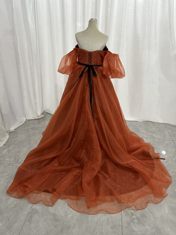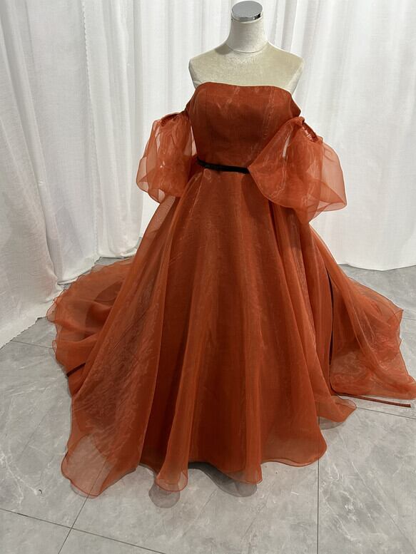 実例写真!カラードレス オレンジ ベアトップ 取り外し袖 上質オーガンジー ふわふわドレス 披露宴