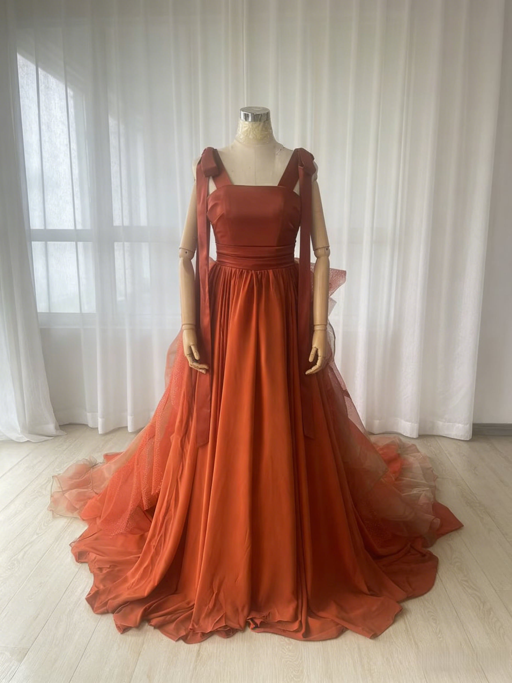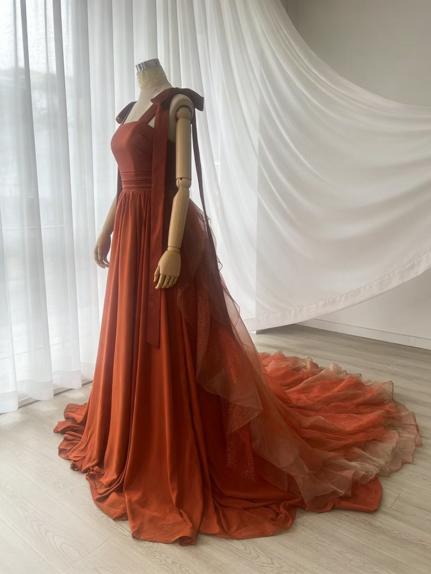 豪華!テラコッタカラードレス ベアトップ リボンショルダー ラッフルフリル 華やかなトレーン 披露宴