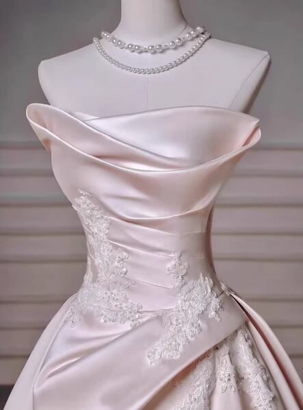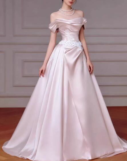 カラードレス ピンク 光沢サテン 取り外しオフショルダー 魅惑の花レース 編み上げ 披露宴