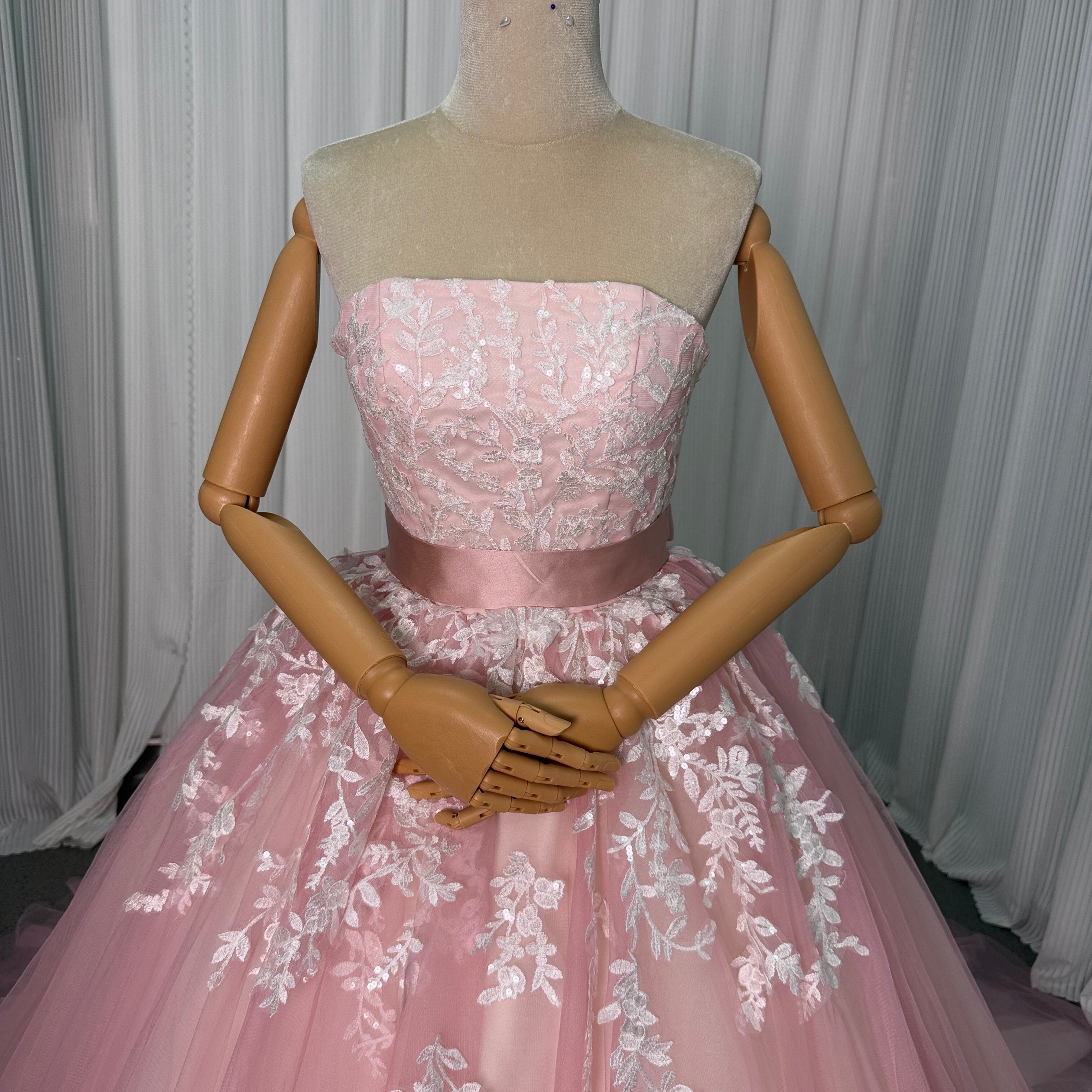 カラードレス 薄桃色 ベアトップ キラキラ光る刺繍 リーフ刺繍 ミニトレーン 編み上げ フレアスカート 花嫁