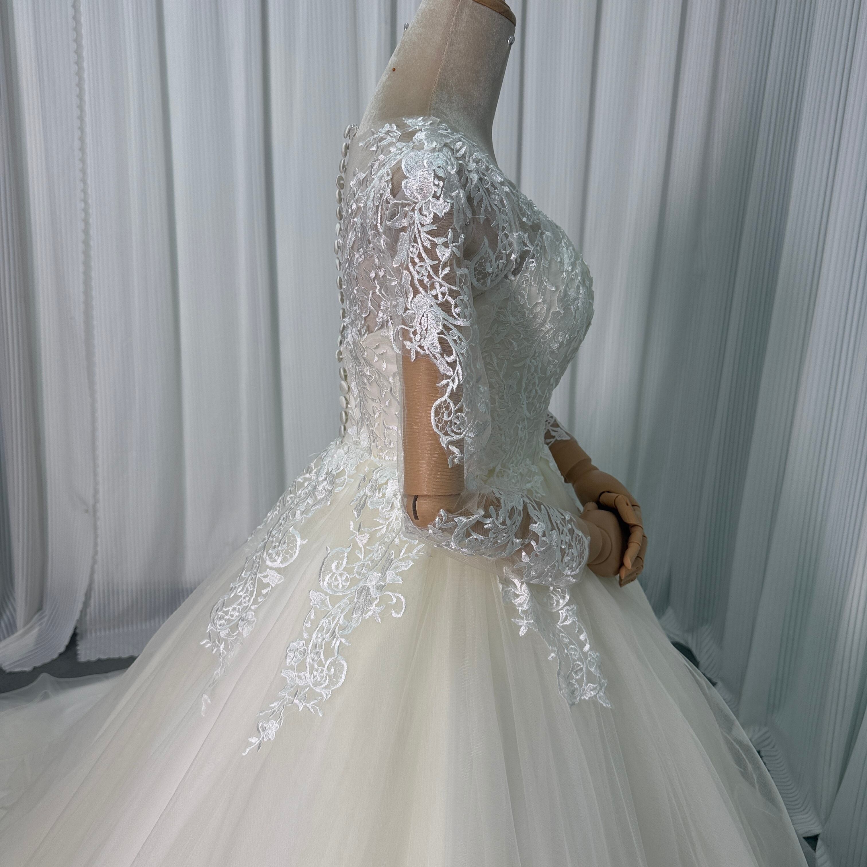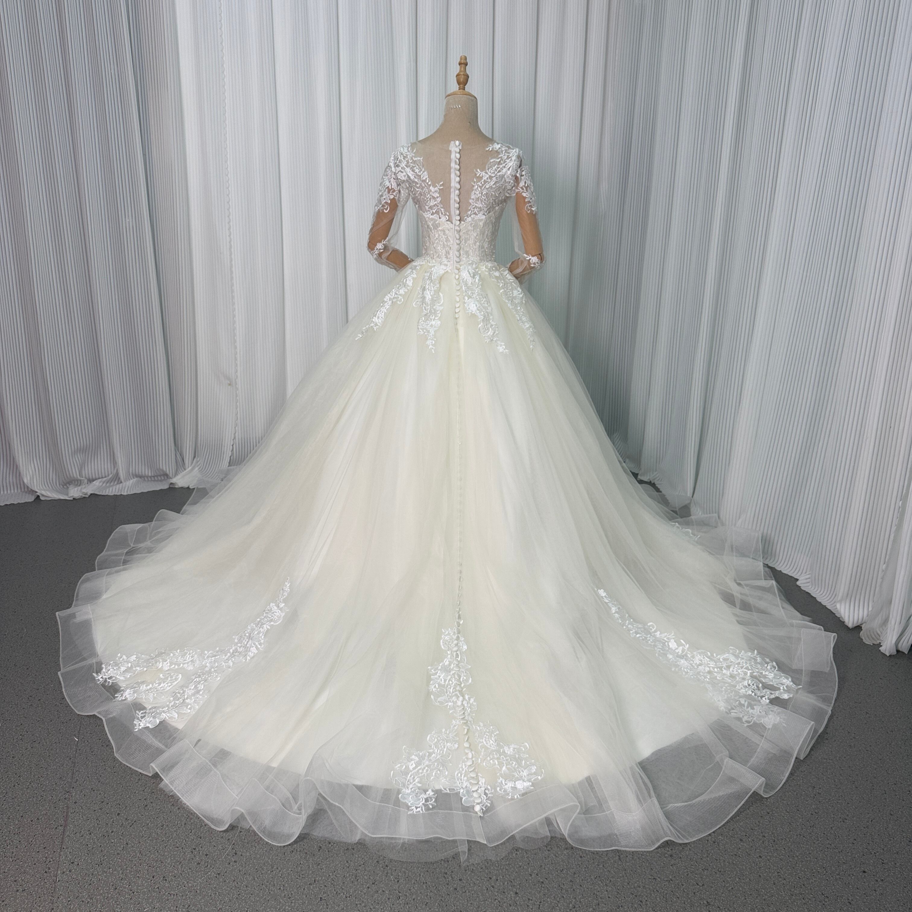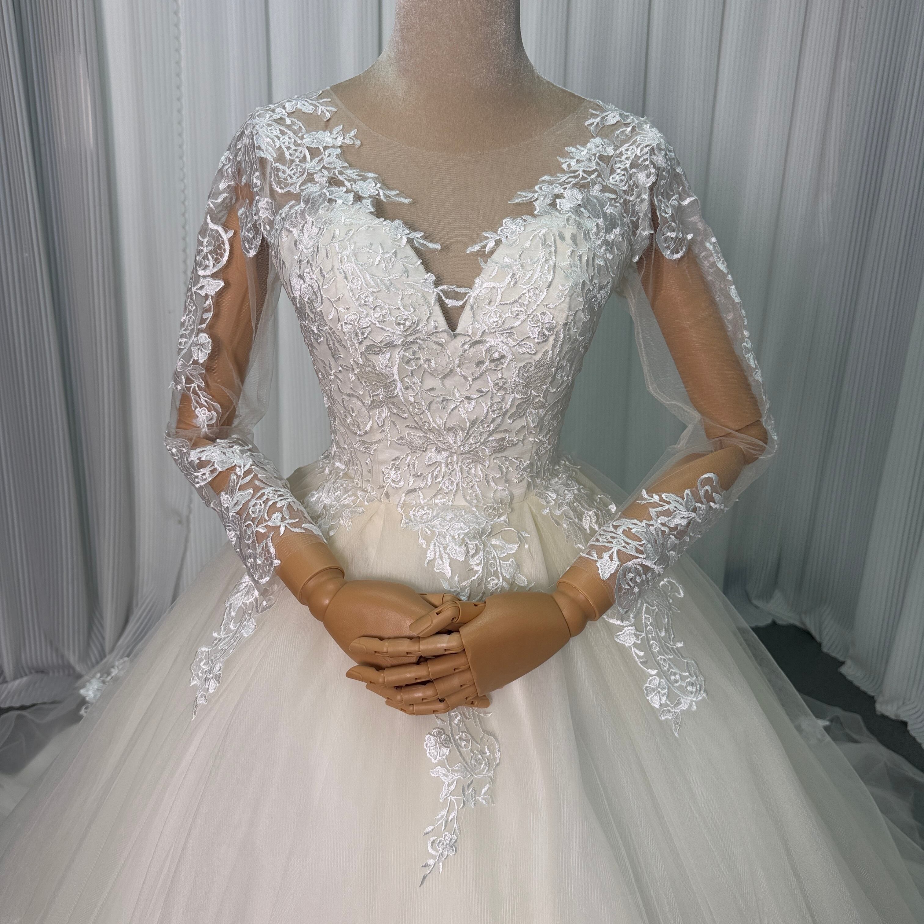 フランス風 ウェディングドレス アイボリー 流れる透け花レース シースルー袖 プリンセスライン くるみボタン 結婚式