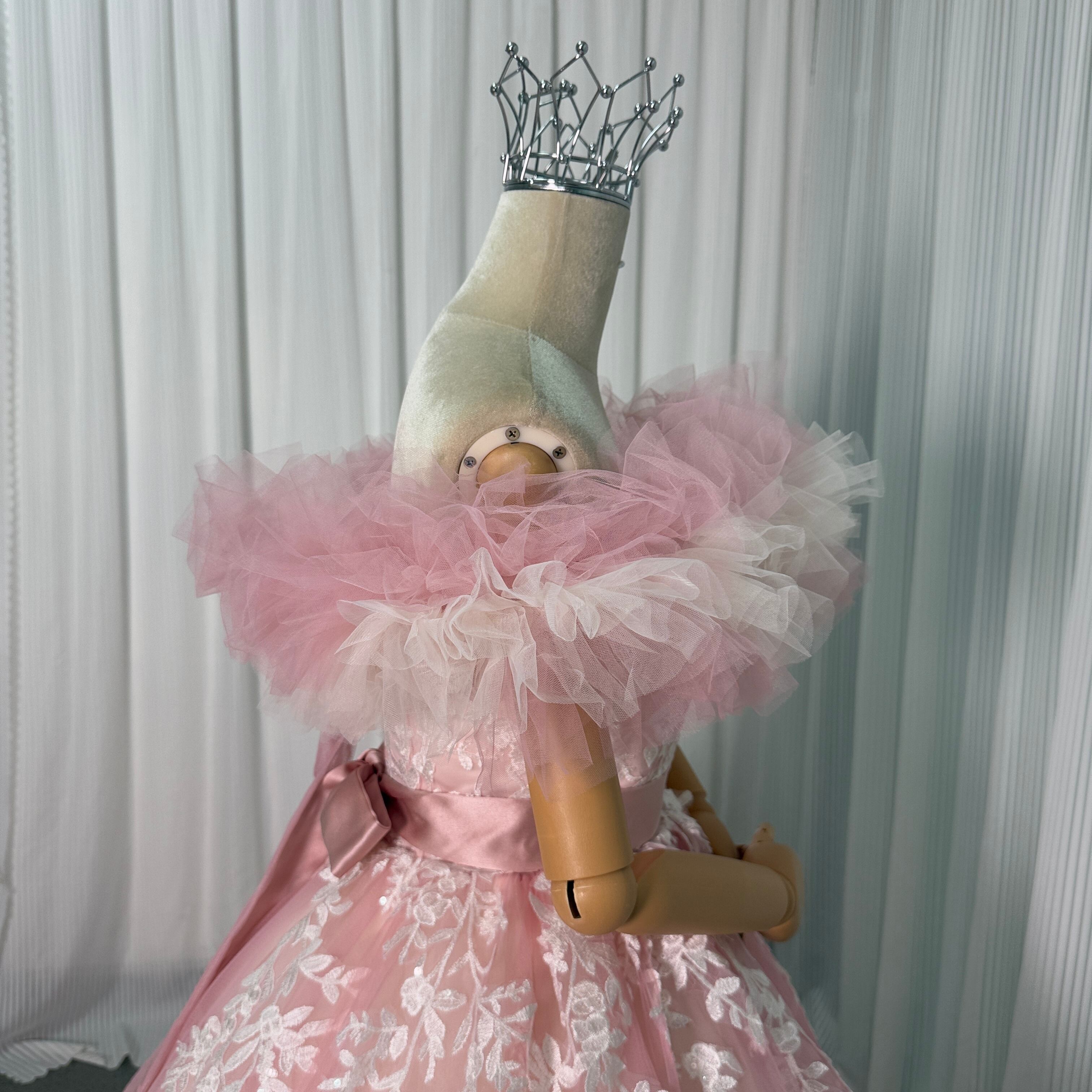 カラードレス 薄桃色 取り外しオフショルダー キラキラ光る刺繍 リーフ刺繍 ミニトレーン 編み上げ フレアスカート 花嫁