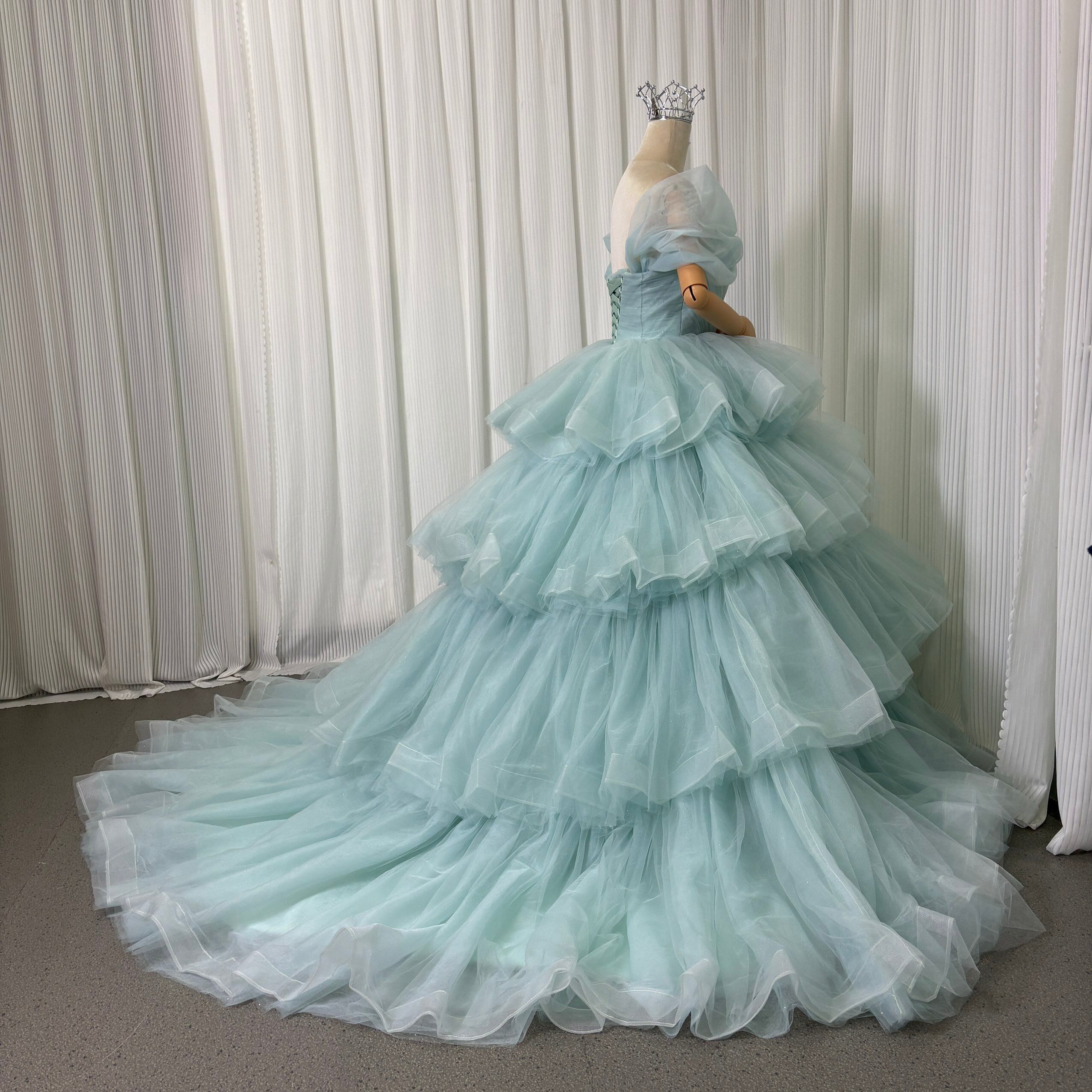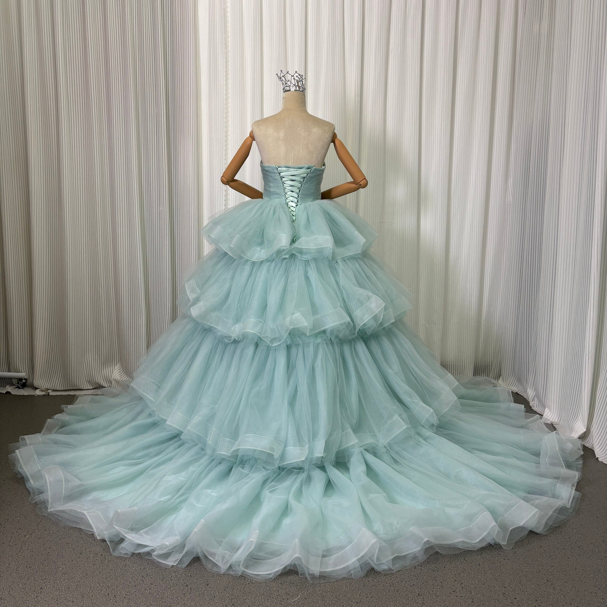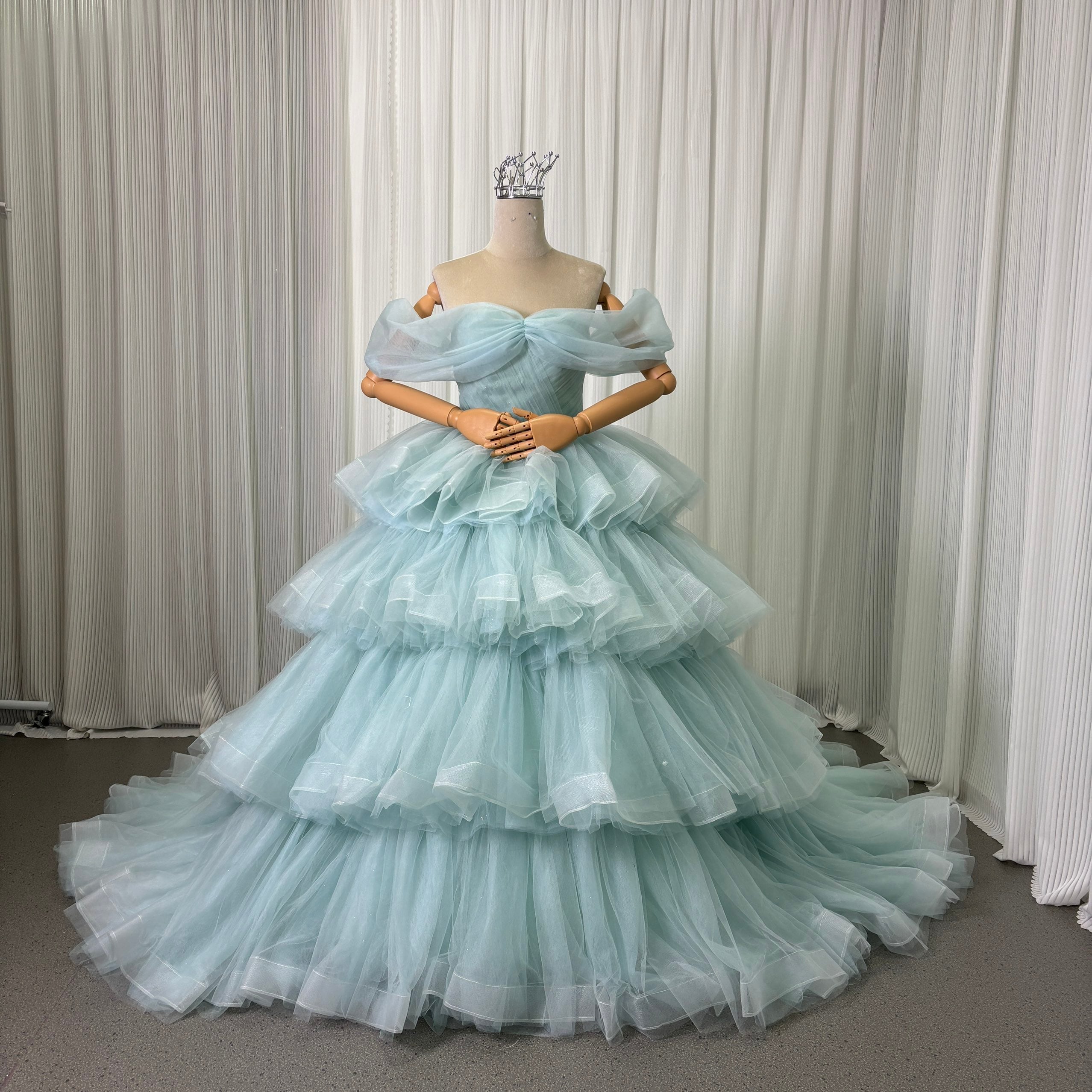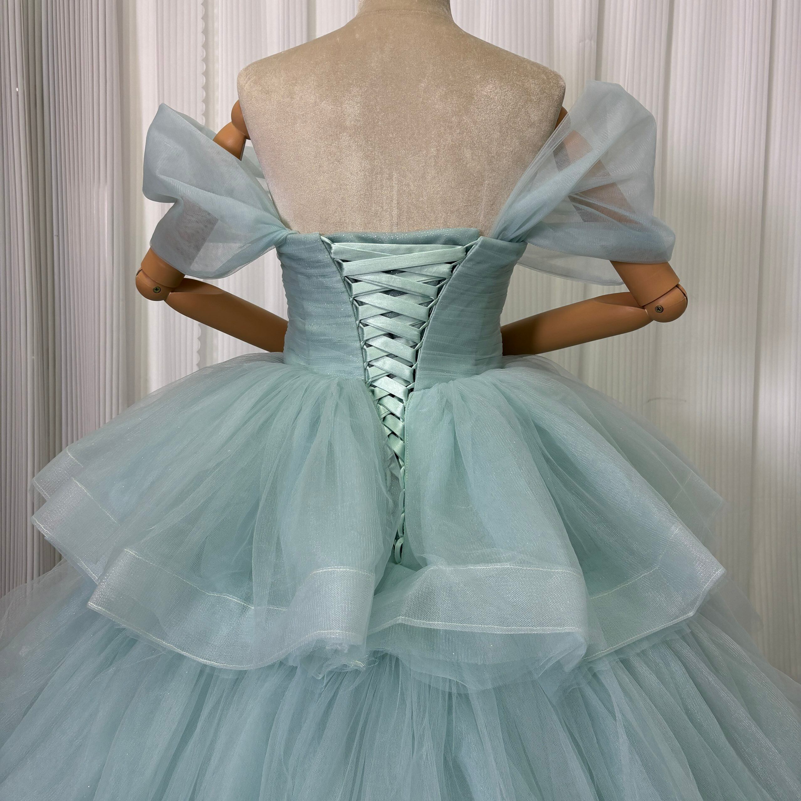 美品!カラードレス ライトブルー 取り外しオフショルダー キラキラ 柔らかく重ねたチュールスカート 披露宴