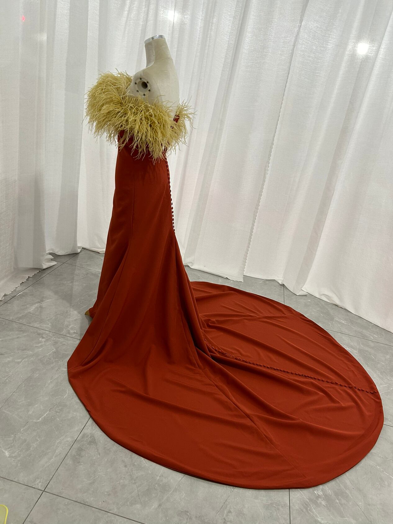 カラードレス テラコッタ色 ベアトップ オーストリッチ くるみボタン ロングトレーン マーメイドライン 披露宴
