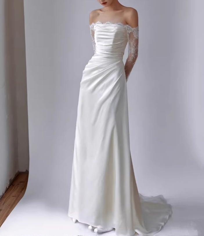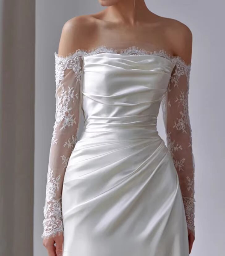 ウエディングドレス オフショルダー 上品透け袖 優雅なシルエット 繊細レース ミニトレーン 結婚式