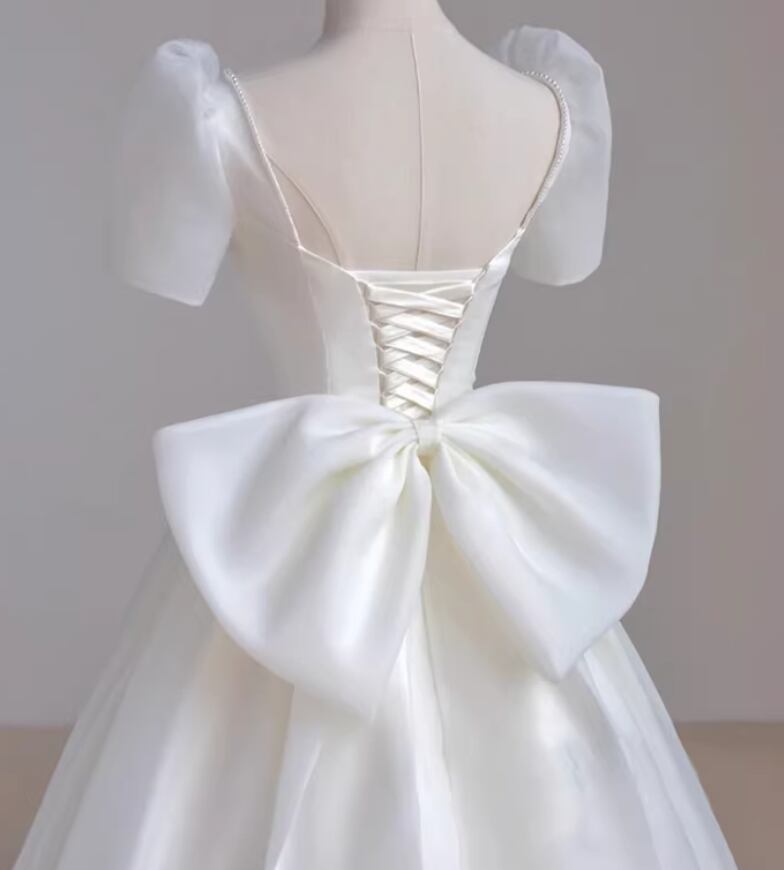 ウェディングドレス Aライン パフスリーブ 豪華なバックリボン ロング 編み上げ 可愛い 結婚式