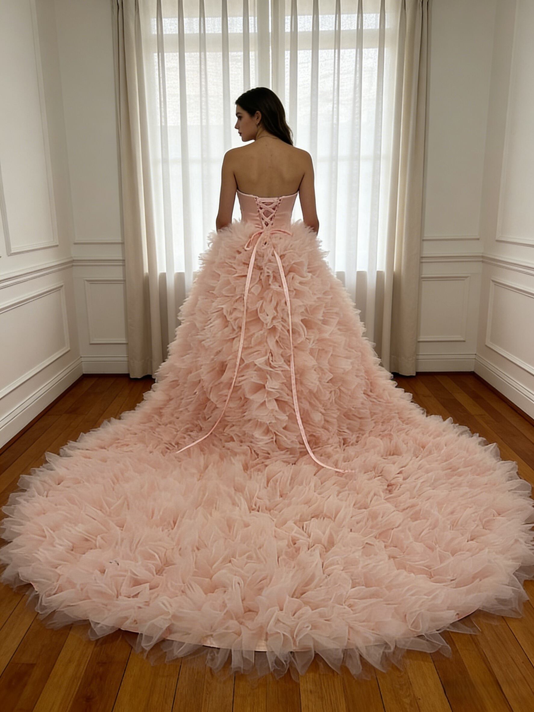 豪華!カラードレス ピンク ベアトップ ラッフルフリル 可愛い 編み上げ ボリュームドレス 前撮り