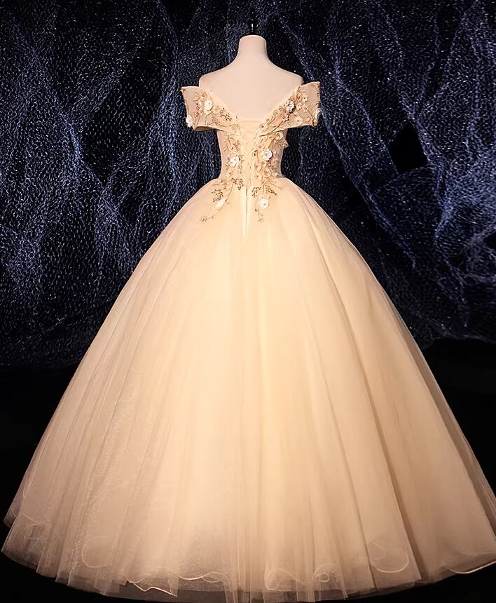 カラードレス シャンパン色 オフショルダー 3D立体レース刺繍 フレアスカート 編み上げ 披露宴