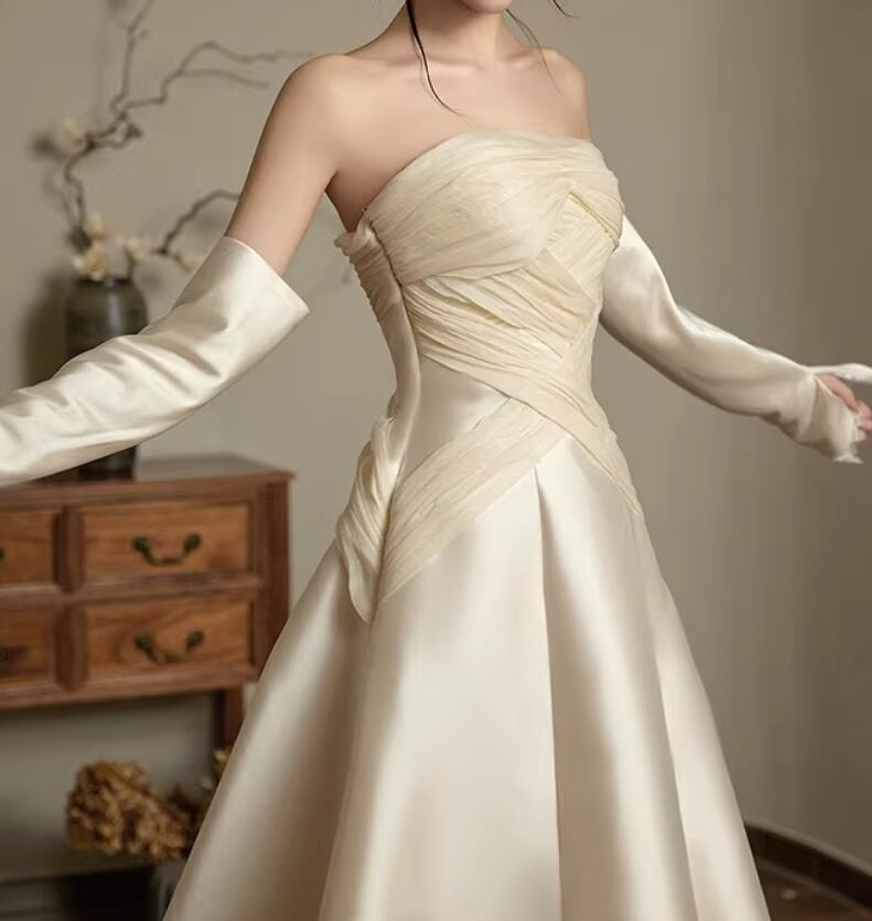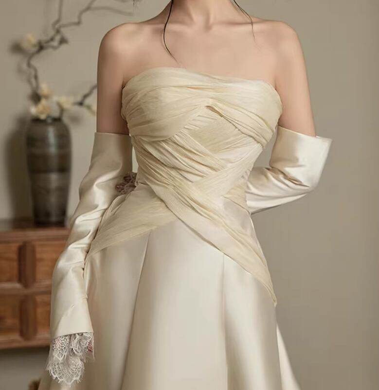 上品!ウェディングドレス ベアトップ ハンドドレープ ロングスリーブ 光沢サテン 結婚式