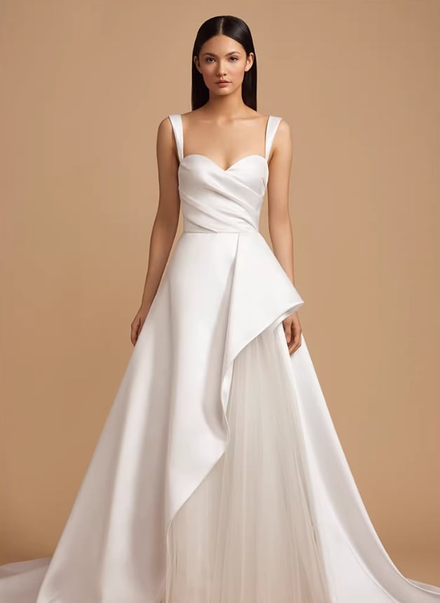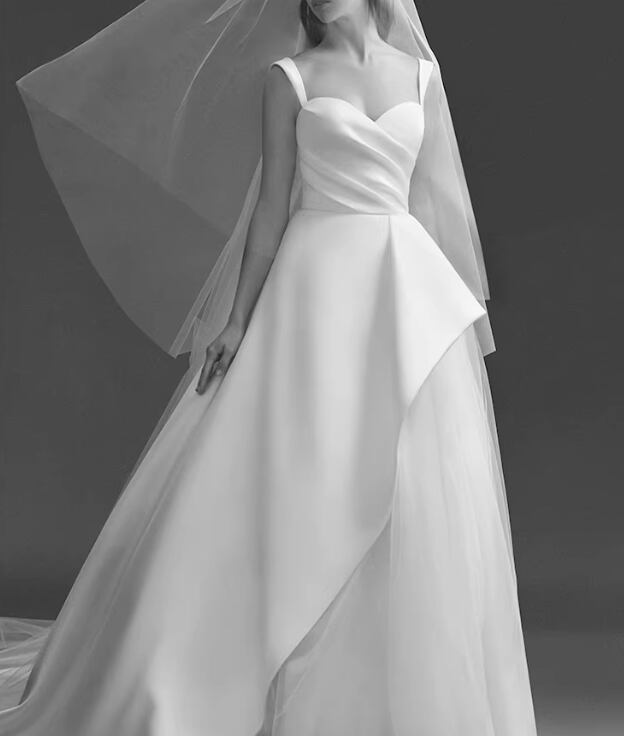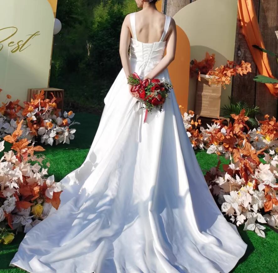 フランス風 ウェディングドレス キャミソール ロイヤルサテン ラッフルフリル ロングトレーン 拳式
