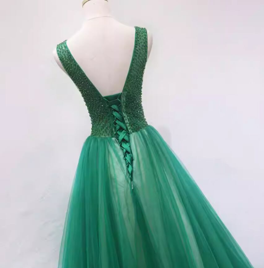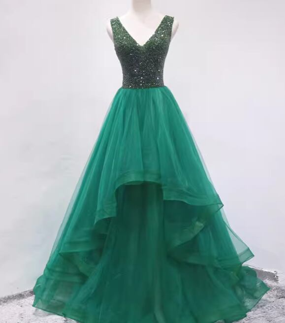 カラードレス グリーン Vネックドレス カラーストーン ソフトチュール ラッフルフリル 編み上げ 演奏会