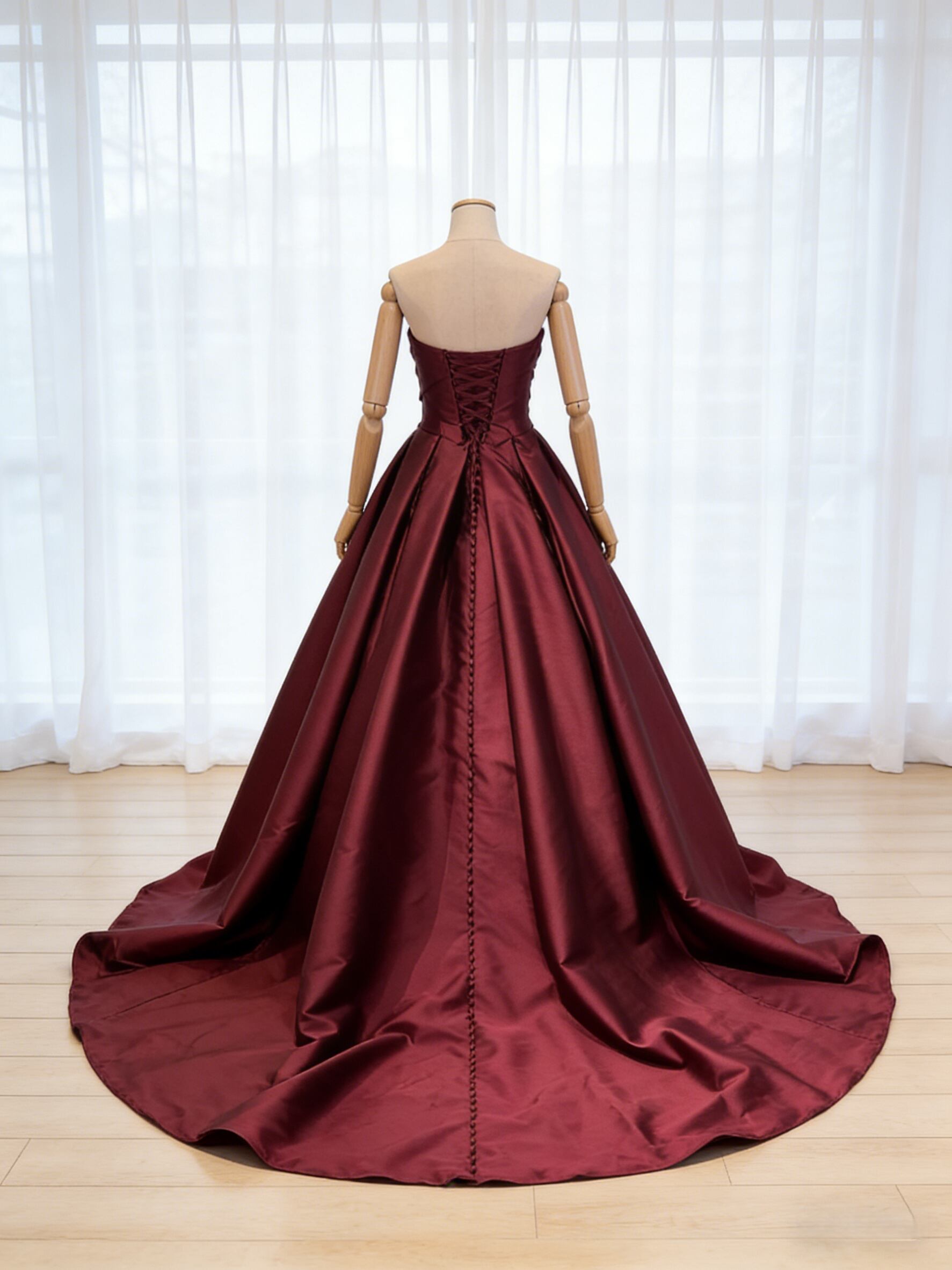 カラードレス ワインレッド ベアトップ ハンドドレープ 光沢サテン 編み上げ くるみボタン 披露宴