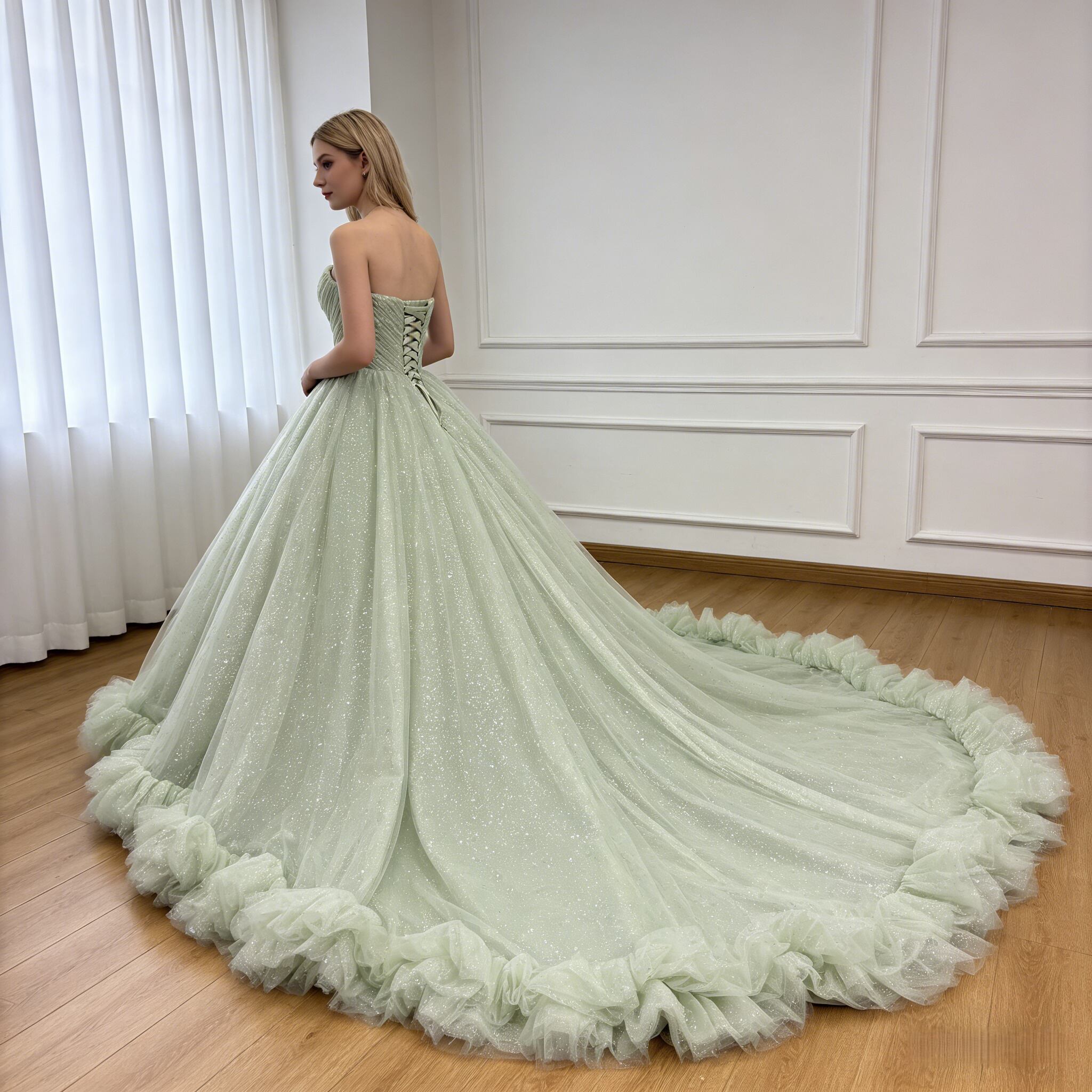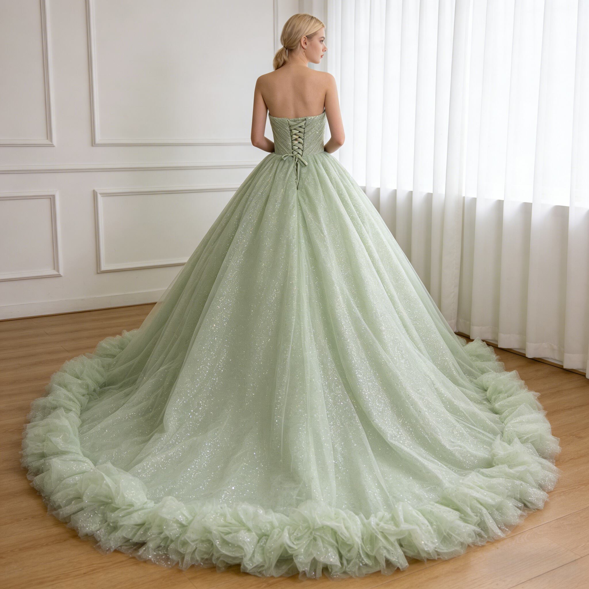 カラードレス ミントグリーン キラキラチュール ベアトップ フレアスカート ラッフルフリル 編み上げ 花嫁