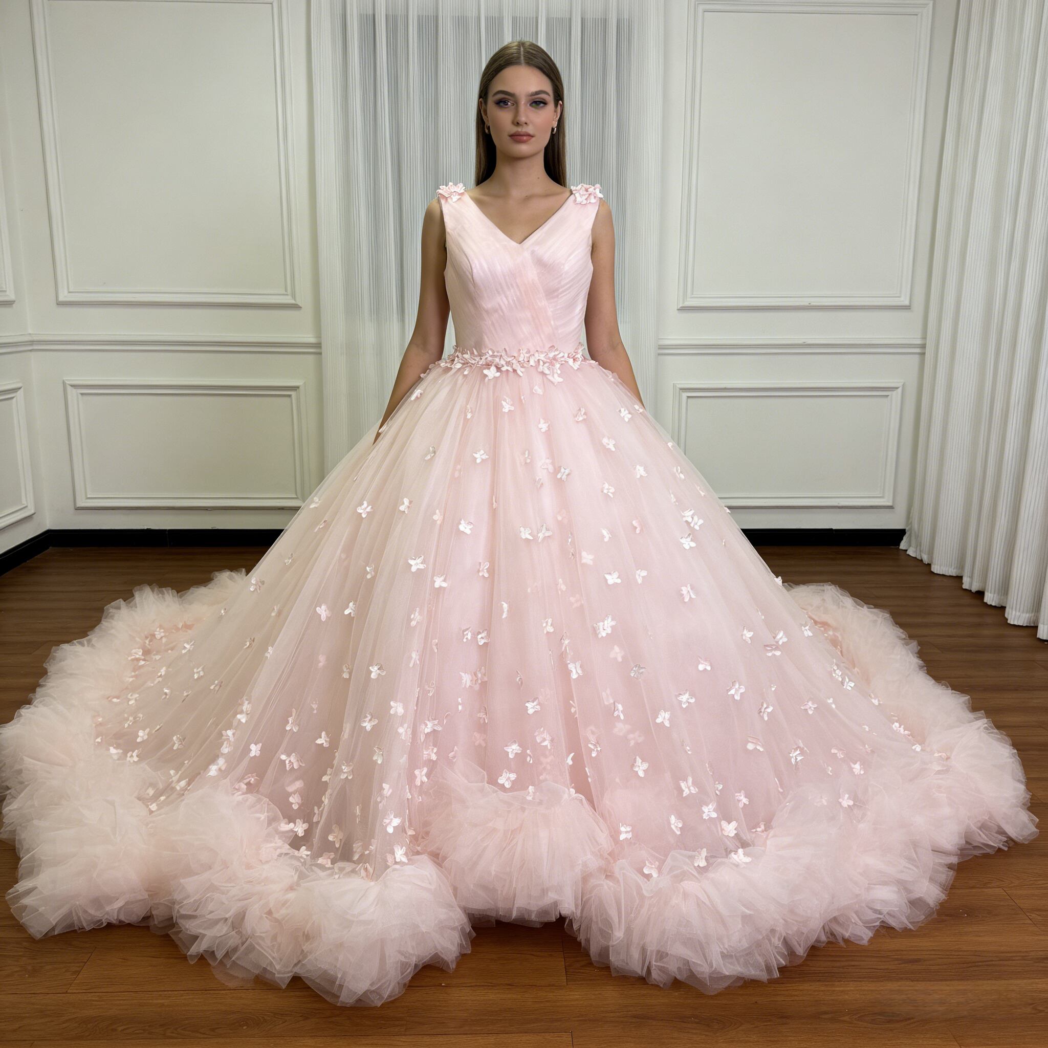カラードレス 薄桃色 Vネック 花モチーフ ボリュームドレス ラッフルフリル ロングトレーン 前撮り
