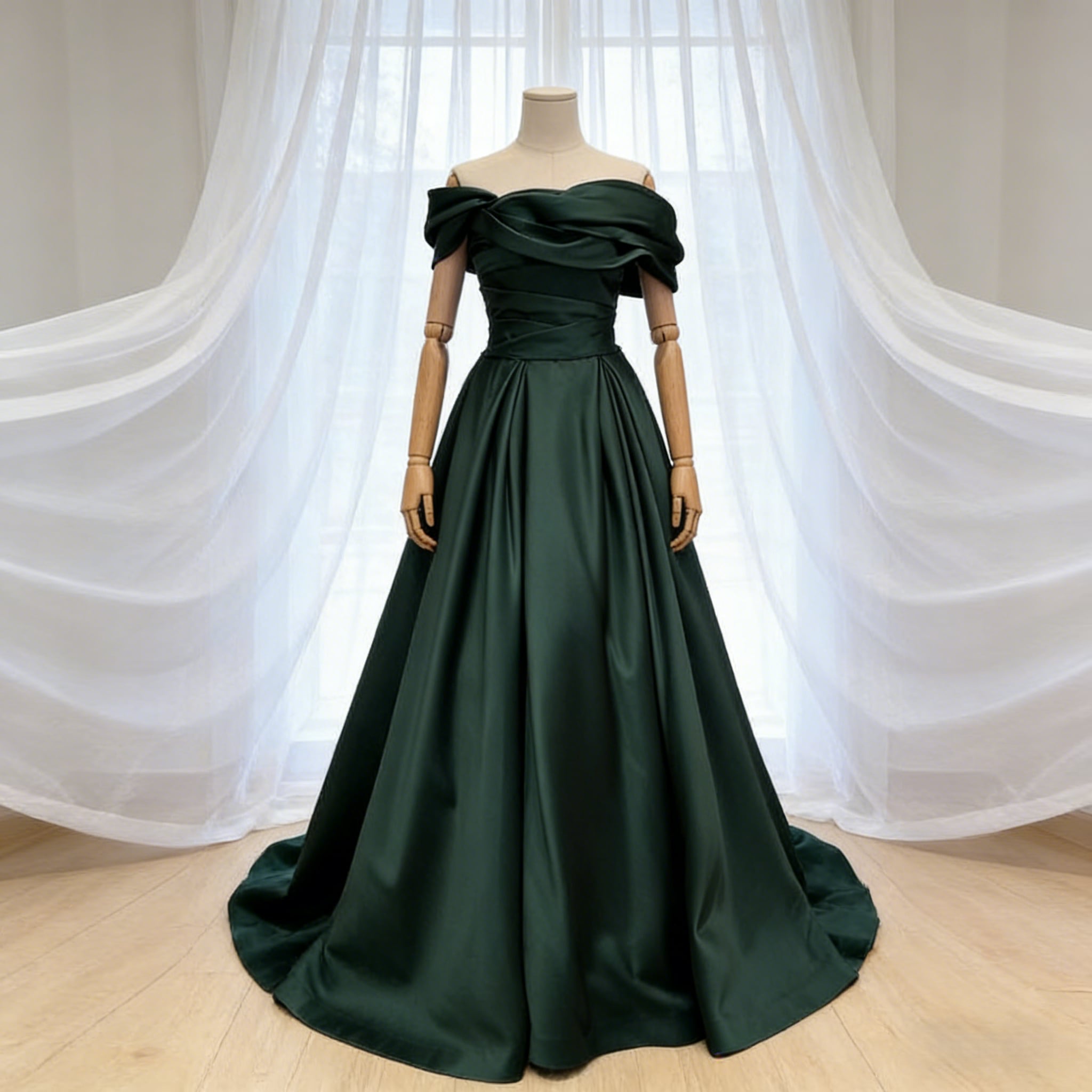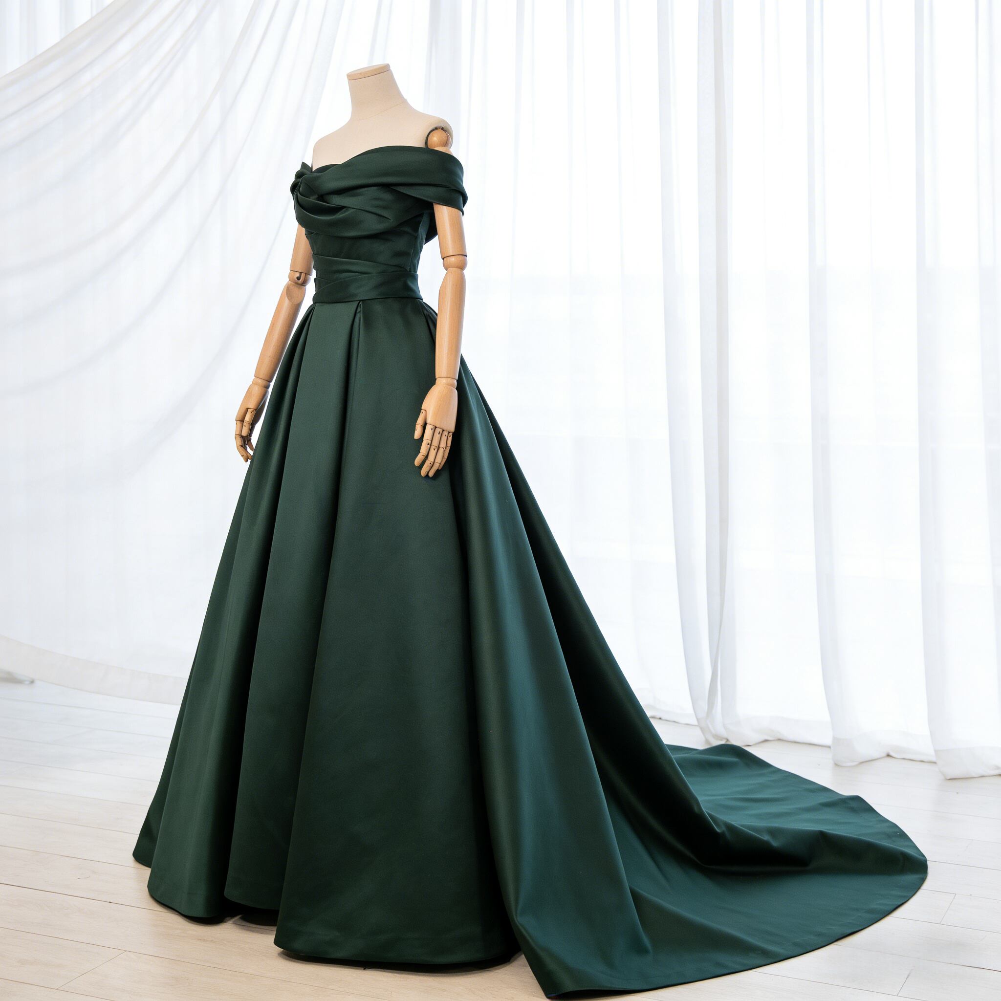 カラードレス 深めな緑 オフショルダー ハンドドレープ 光沢サテン 編み上げ 細見えシルエット 披露宴