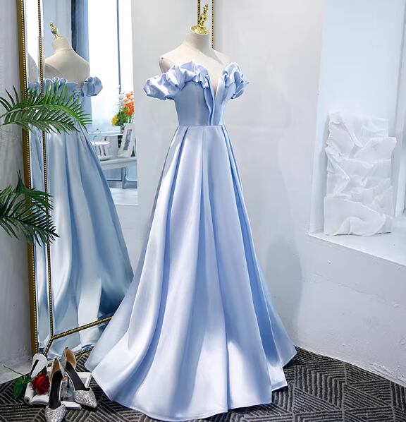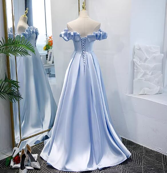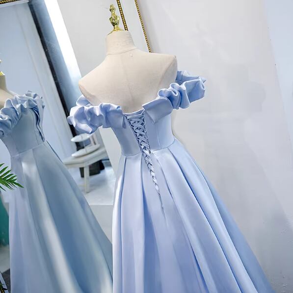 カラードレス ライトブルー オフショルダー ラッフルフリル スレンダーライン 編み上げ 披露宴