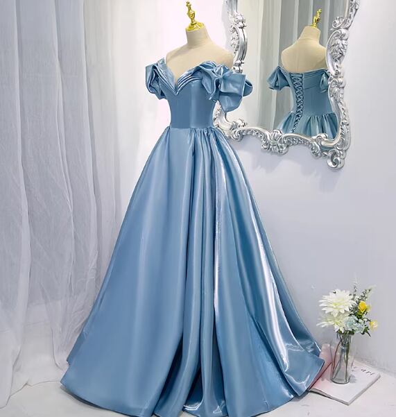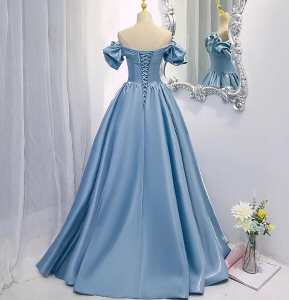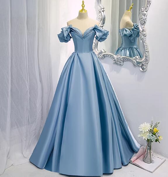 上品!カラードレス ブルー オフショルダー フリル袖 ハンドドレープ 光沢サテン Aライン 謝恩会