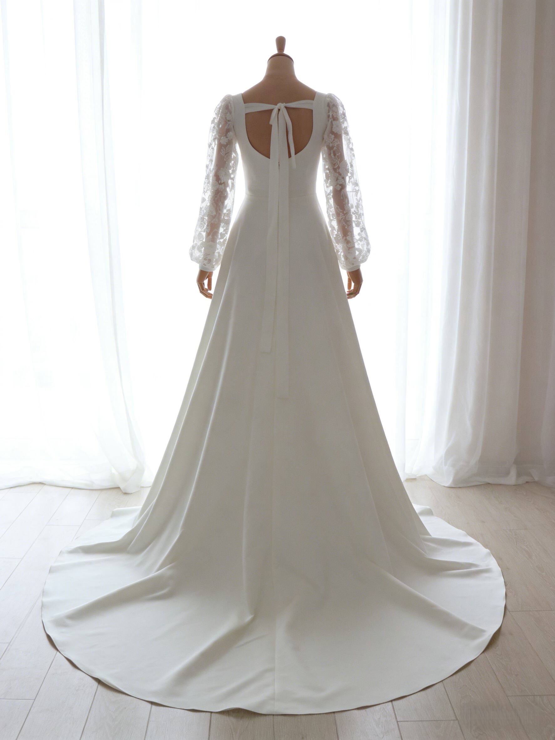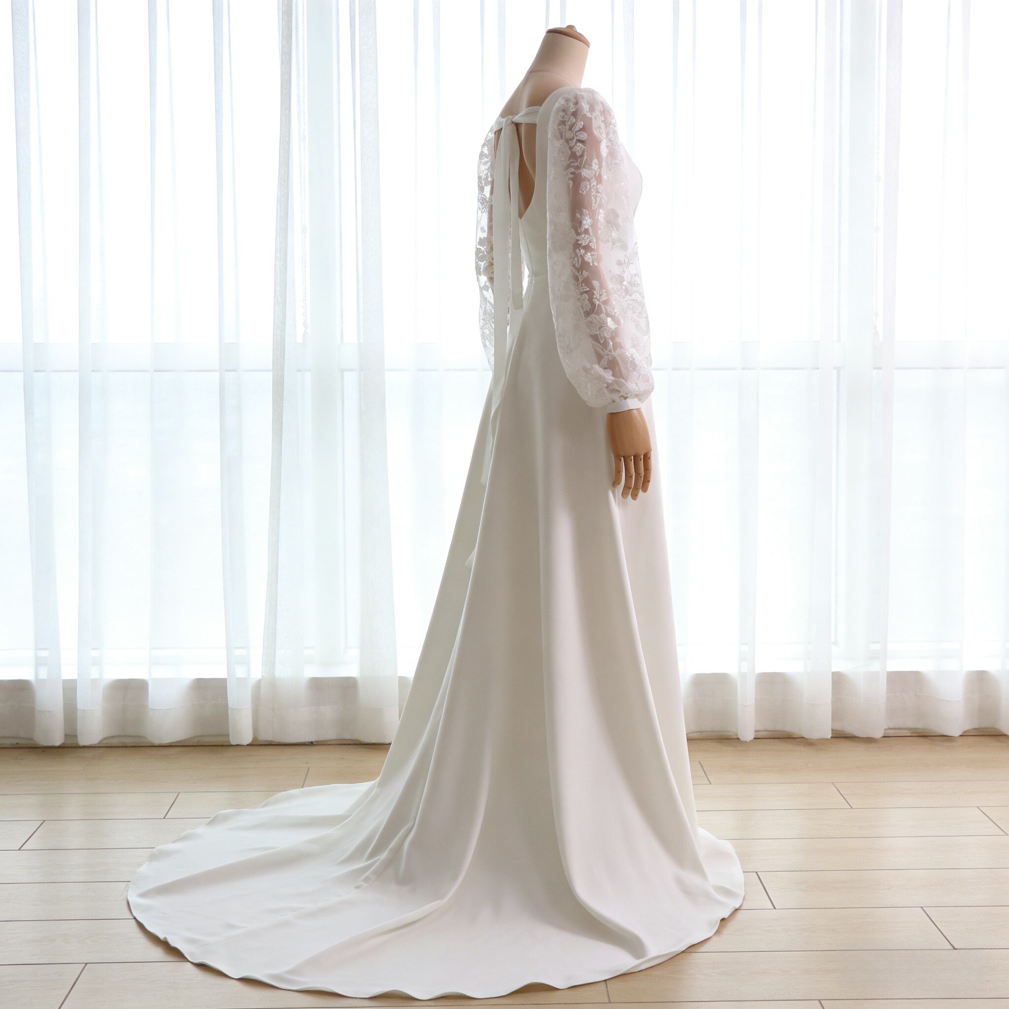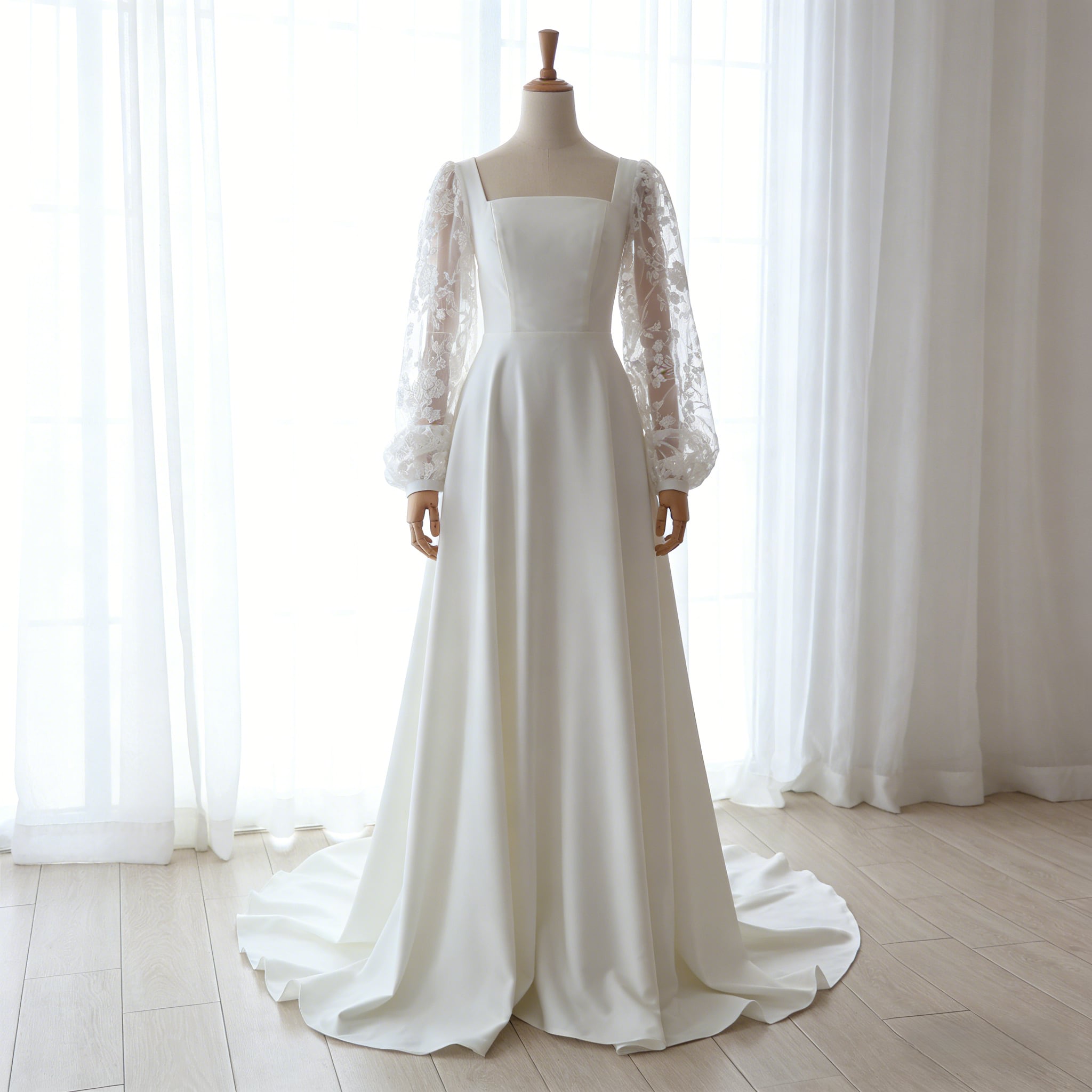 ウエディングドレス スクエアネック 上品透け袖 流れる透け花レース 優雅なシルエット 背中見せ 前撮り