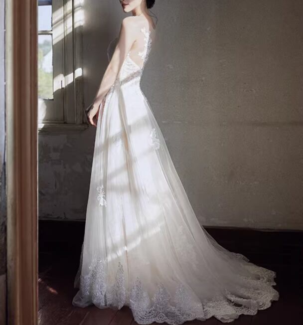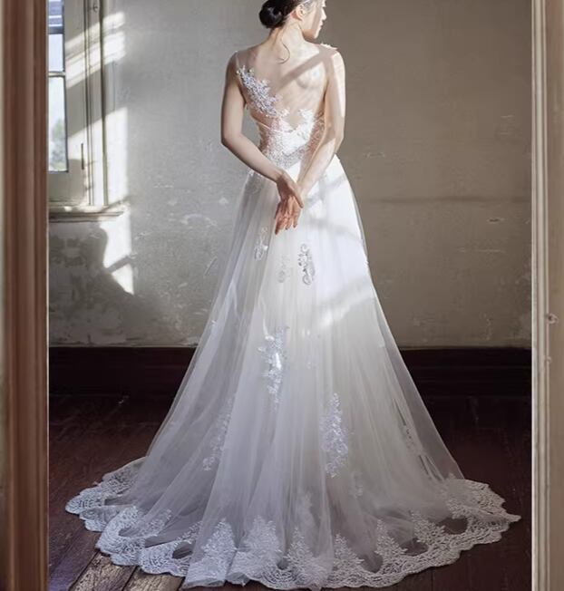 豪華!ウェディングドレス ノースリーブ 流れる透け花レース 背中見せ 華やかなトレーン 憧れのドレス 結婚式