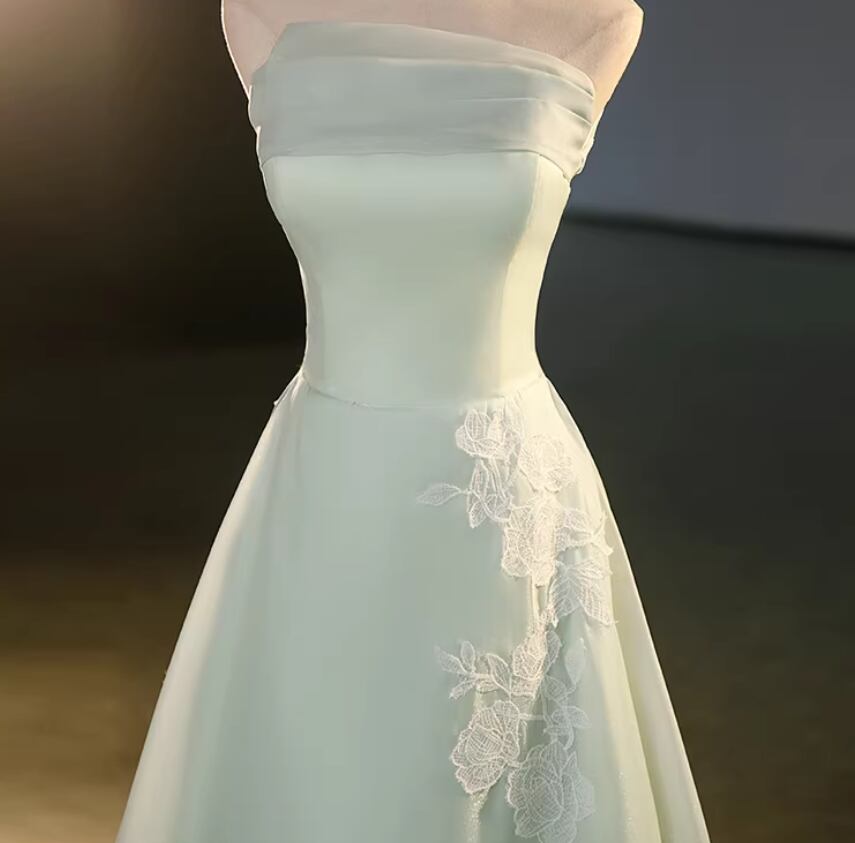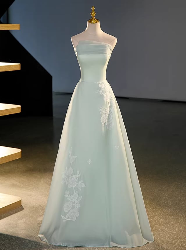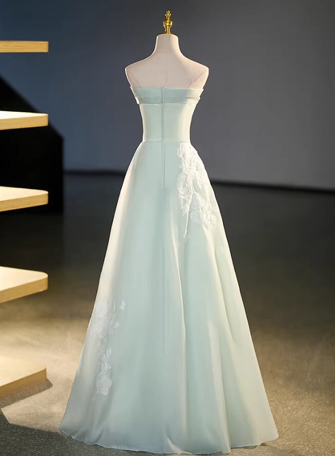 カラードレス ライトグリーン ベアトップ Aライン 美しい花レース 揺らめく裾 演奏会/音楽会