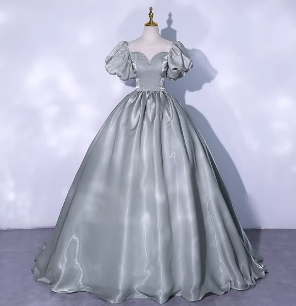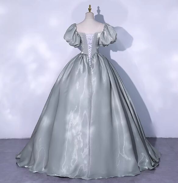 カラードレス ブルーグレー パフスリーブ フレアスカート 光沢感 ロング 編み上げ 演奏会/音楽会