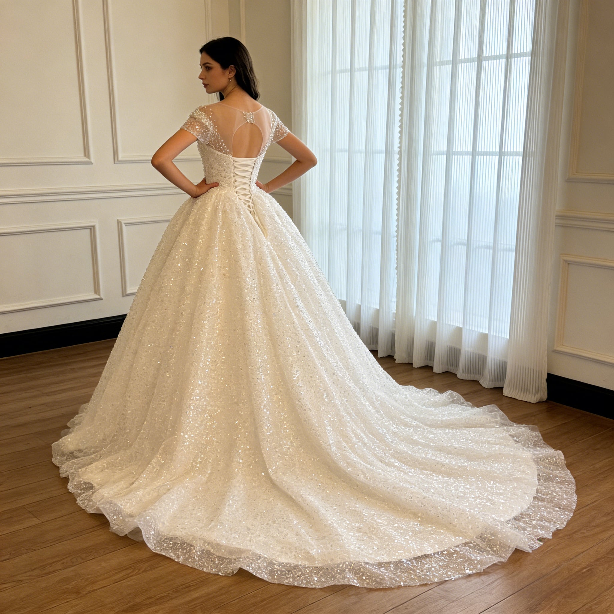 韓国風ドレス ウェディングドレス ラウンドネック 短袖 シークインチュール 華やか 編み上げ 拳式/前撮り