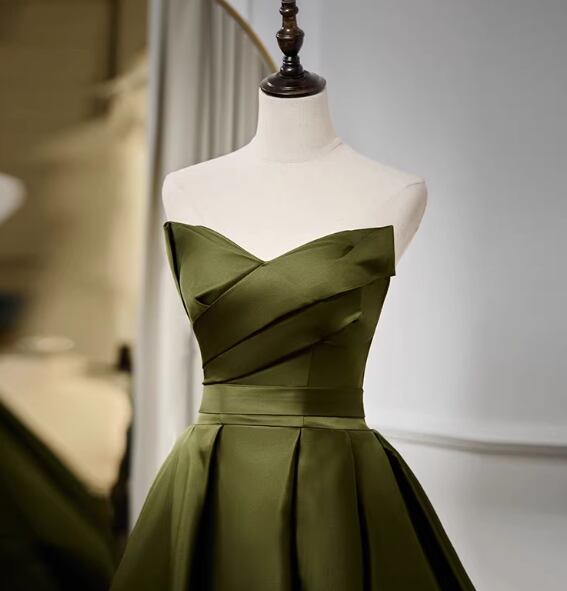 カラードレス 深めな緑 ベアトップ 光沢サテン Aライン クラシカル 編み上げ 演奏会/音楽会