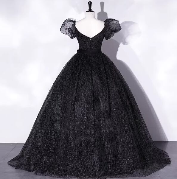パーティードレス ブラック シースルー袖 シークインチュール フレアスカート ファスナー 音楽会/発表会
