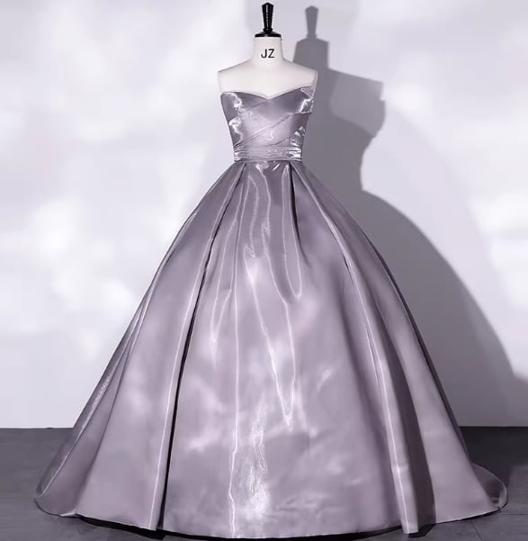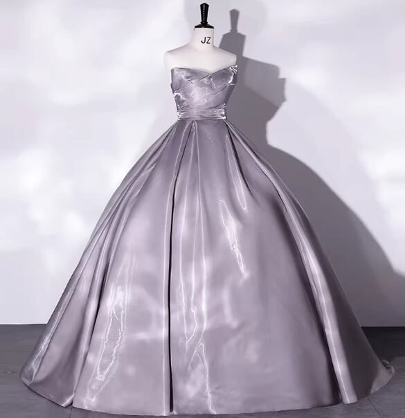 上品!カラードレス グレー ベアトップ フレアスカート 光沢サテン 編み上げ 演奏会/音楽会