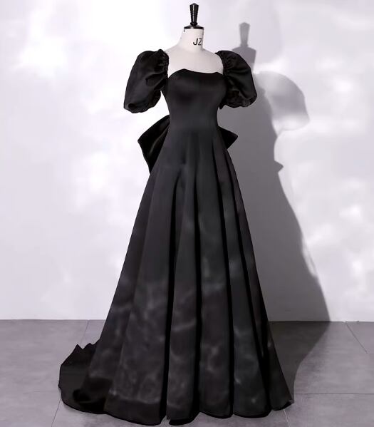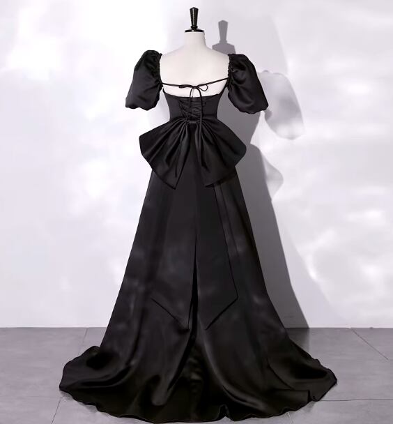 パーティードレス ブラック パフスリーブ 豪華なバックリボン 光沢サテン 背中見せ ミニトレーン 二次会
