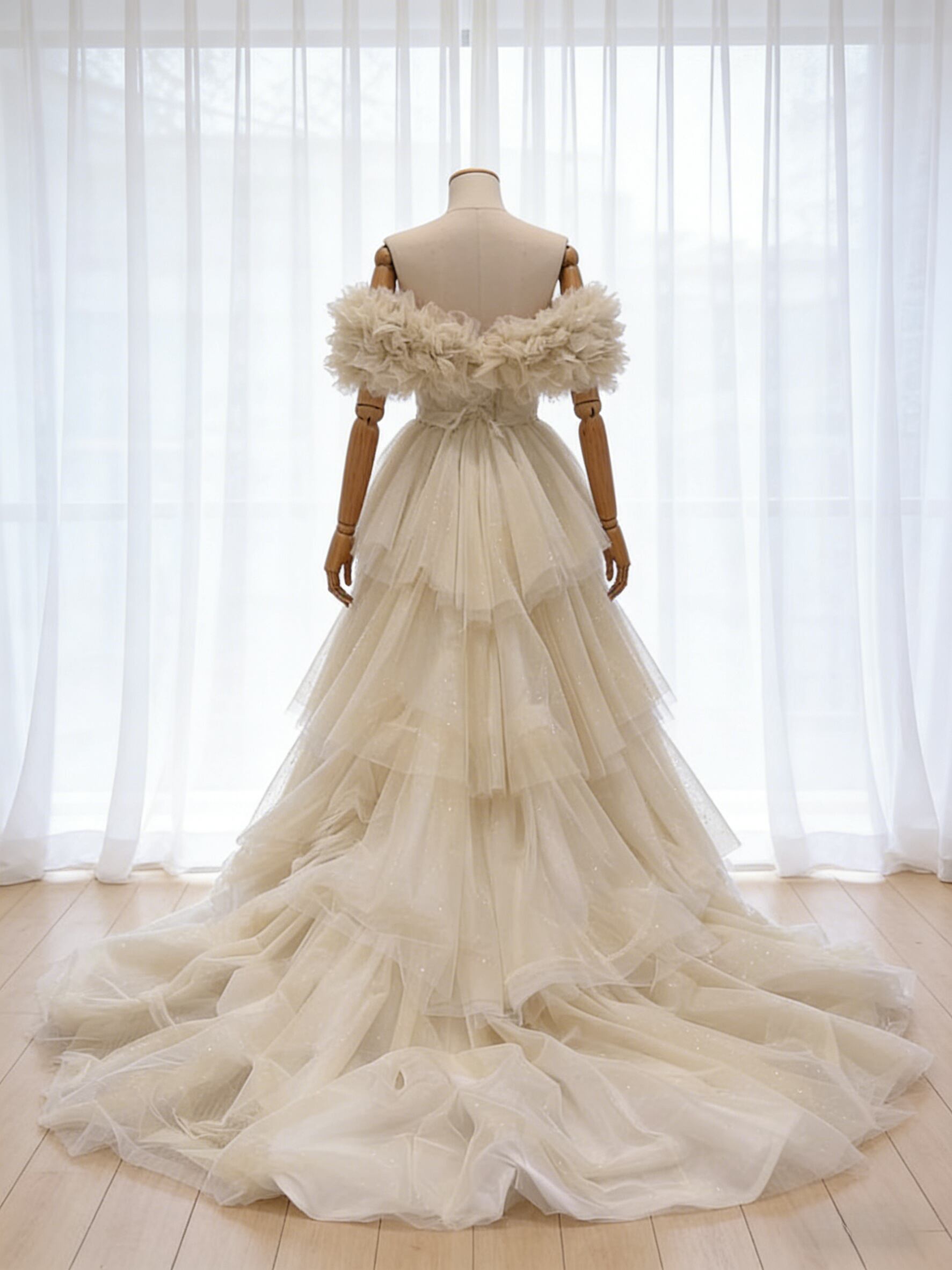 フランス風 カラードレス 薄シャンパンの色 オフショルダー キラキラチュール ボリュームドレス 花嫁