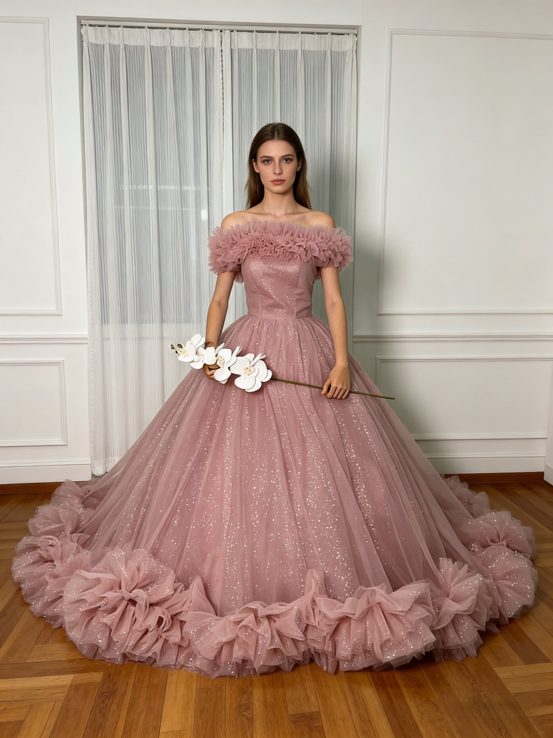 憧れのドレス ピンク カラードレス オフショルダー キラキラチュール ラッフルフリル 編み上げ 花嫁/前撮り