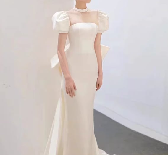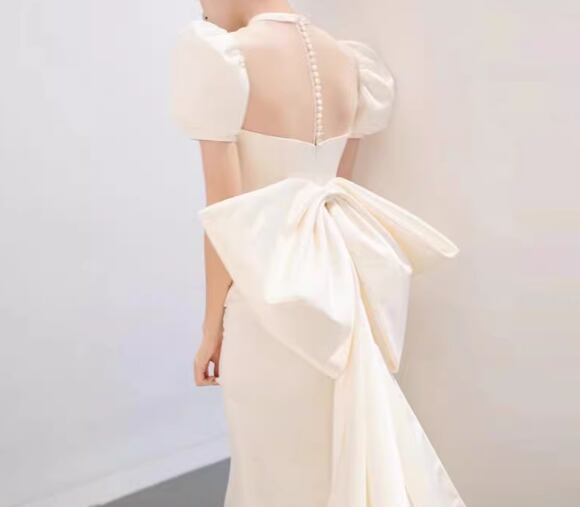 フランス風 ウェディングドレス パフスリーブ 豪華なバックリボン くるみボタン 優雅なシルエット 結婚式