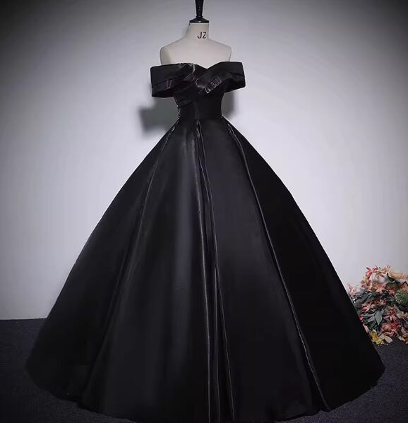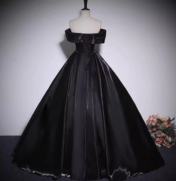 パーティードレス ブラック オフショルダー 光沢サテン フレアスカート クラシカル 披露宴