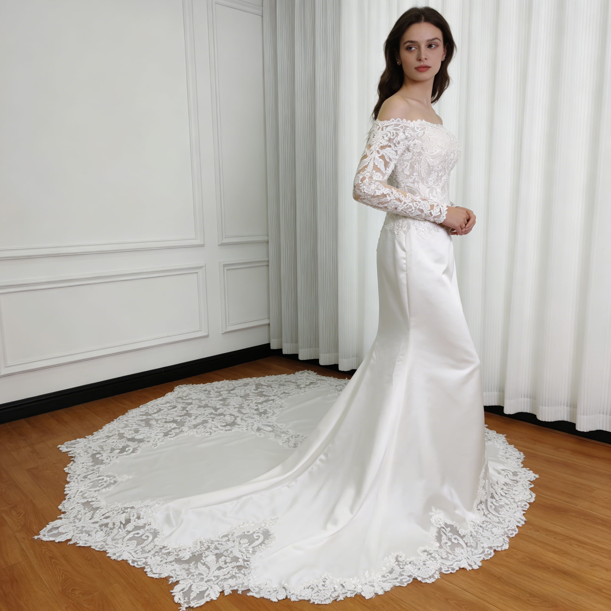高品質!ウェディングドレス オフショルダー 上品レース 長袖 華やかなトレーン デザイン感 くるみボタン 結婚式 前撮り