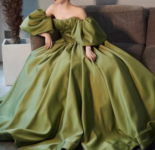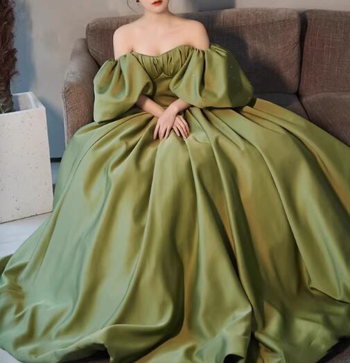 カラードレス グリーン ベアトップ パフスリーブ ビジュー 光沢サテン 大人っぽい 披露宴