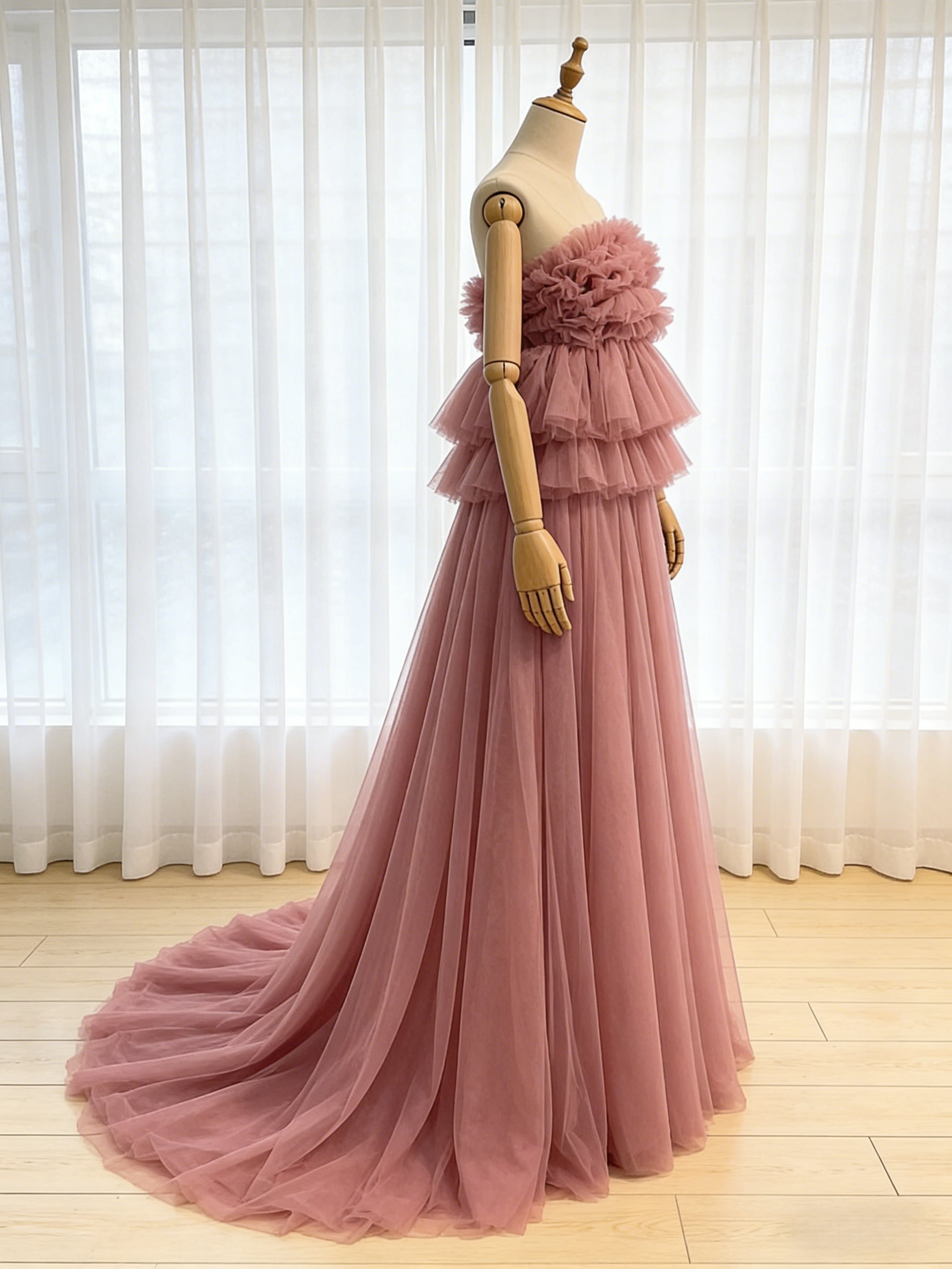カラードレス ローズピンク ベアトップ 胸元フリル ソフトチュール ミニトレーン エレガント 2次会