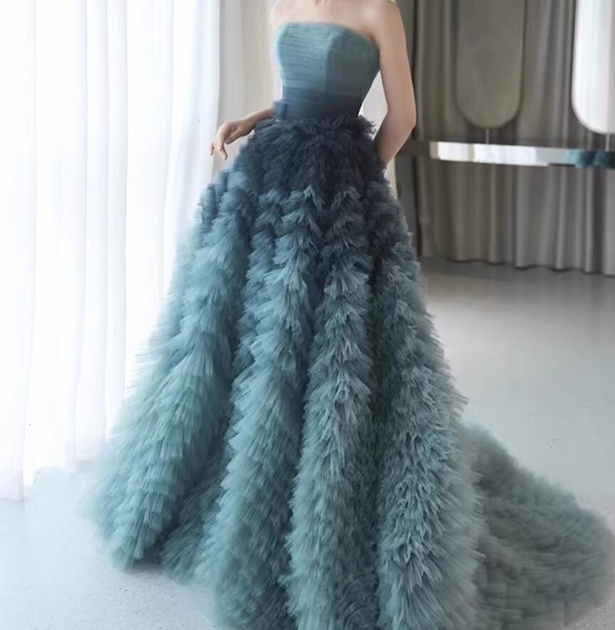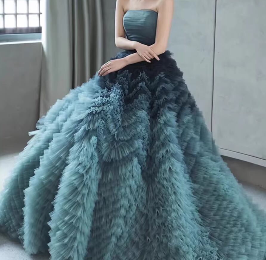 カラードレス ベアトップ ジュエルブルー グラデーション ボリュームドレス 編み上げ 披露宴
