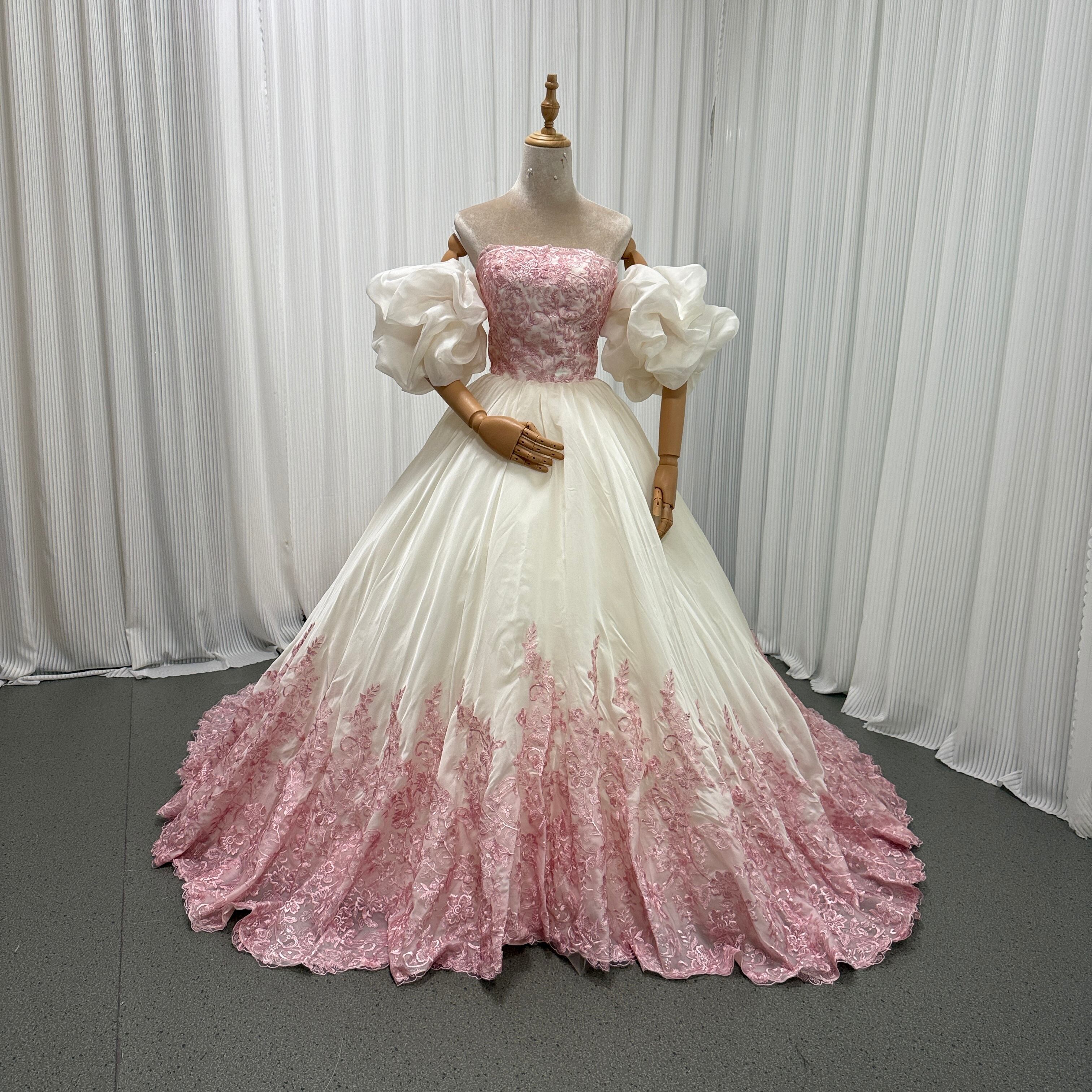 ウエディングドレス ベアトップ フリル袖 薄桃色 流れる透け花レース 華やかなトレーン ソフトオーガンジー 前撮り