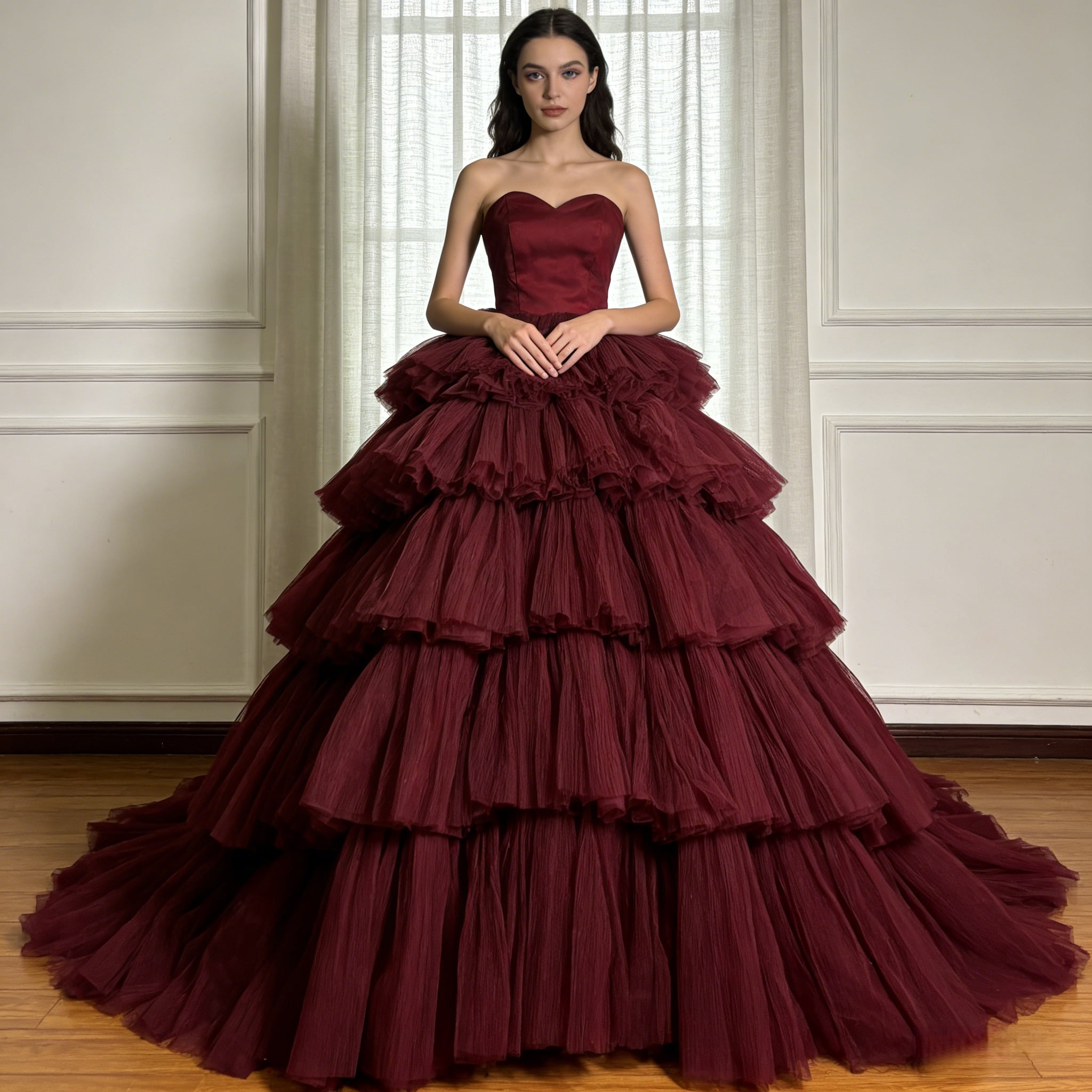 豪華!カラードレス ボルドー色 ベアトップ プリーツスカート ボリュームドレス 編み上げ 花嫁