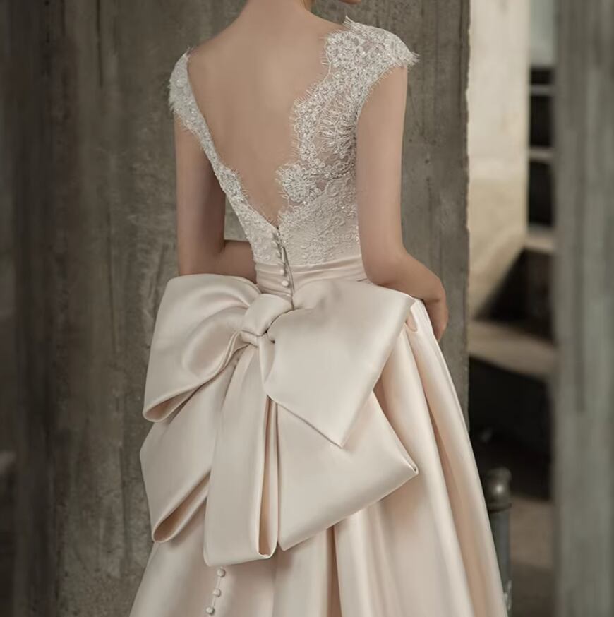 フランス風 ウエディングドレス Vネック 背中見せ 豪華なバックリボン キラキラ光る刺繍 くるみボタン 拳式/前撮り