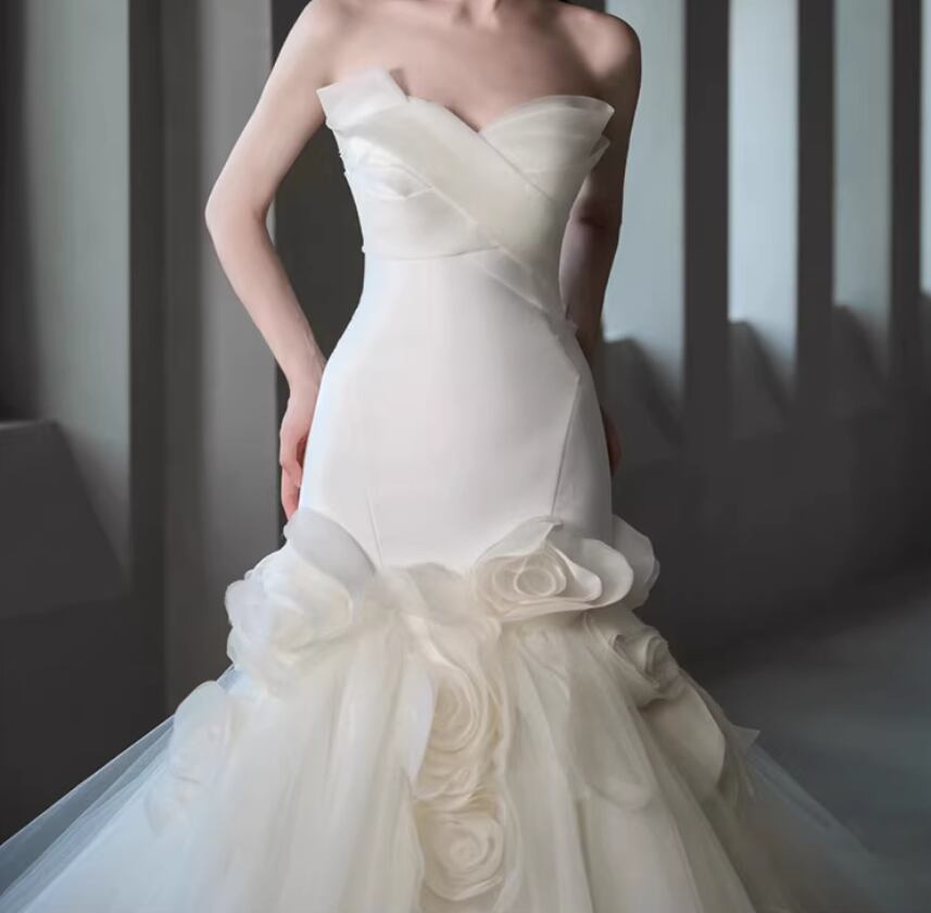 フランス風 ウエディングドレス ベアトップ 優雅なシルエット バラトレーン マーメイドライン 編み上げ 結婚式