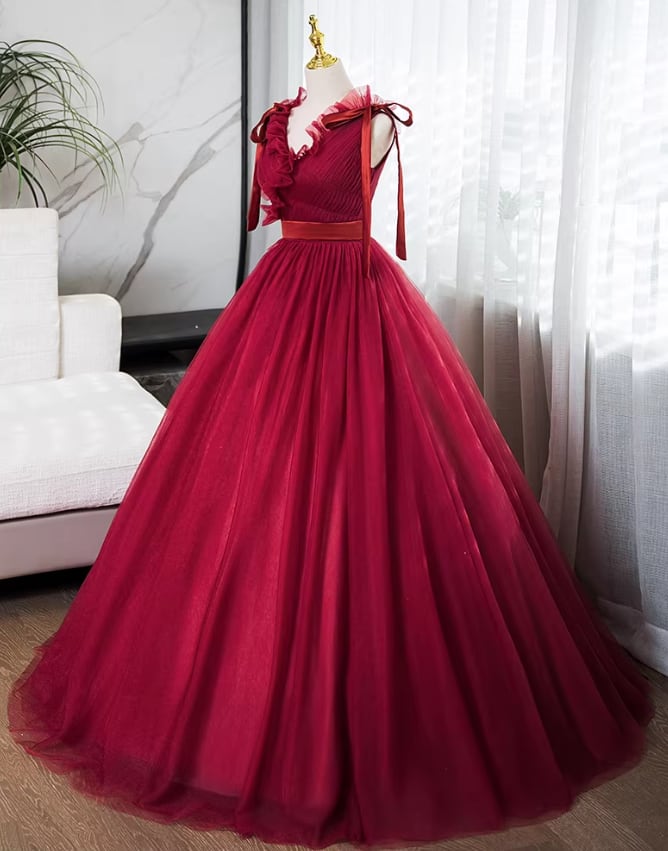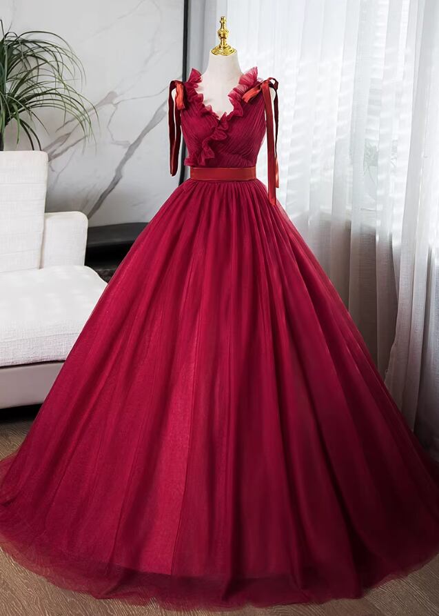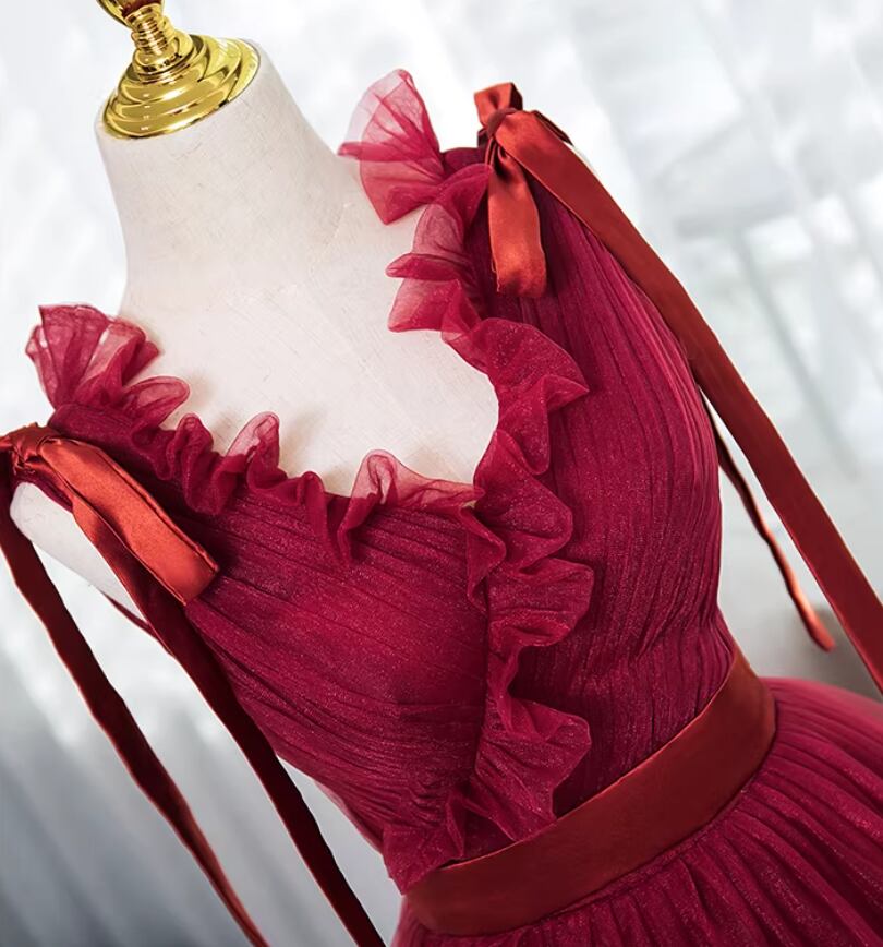 カラードレス ワインレッド Vネック 胸元フリル ノースリーブ フレアスカート 編み上げ 演奏会/音楽会